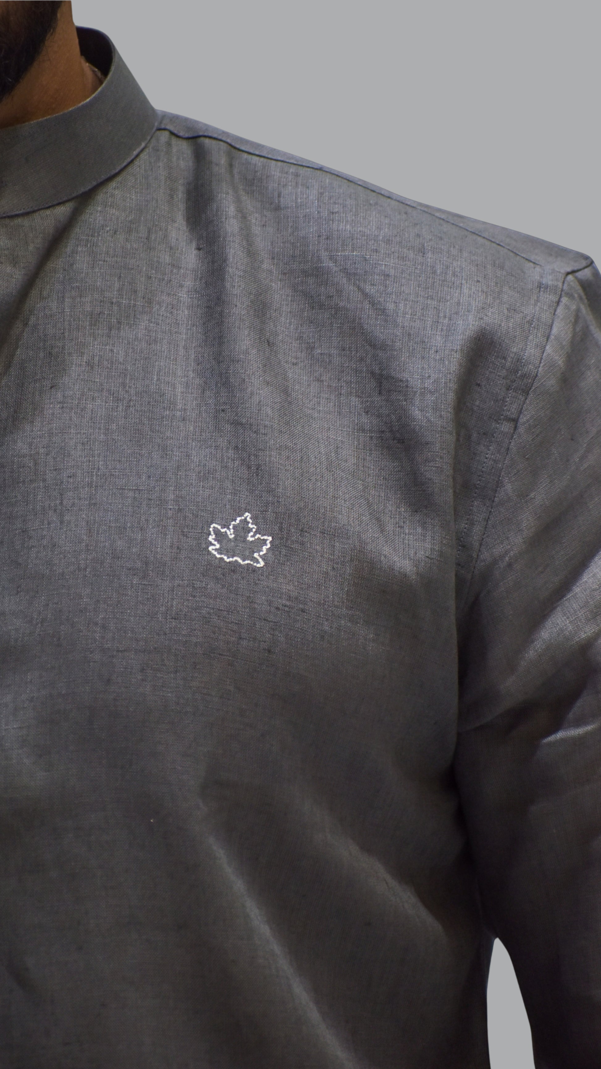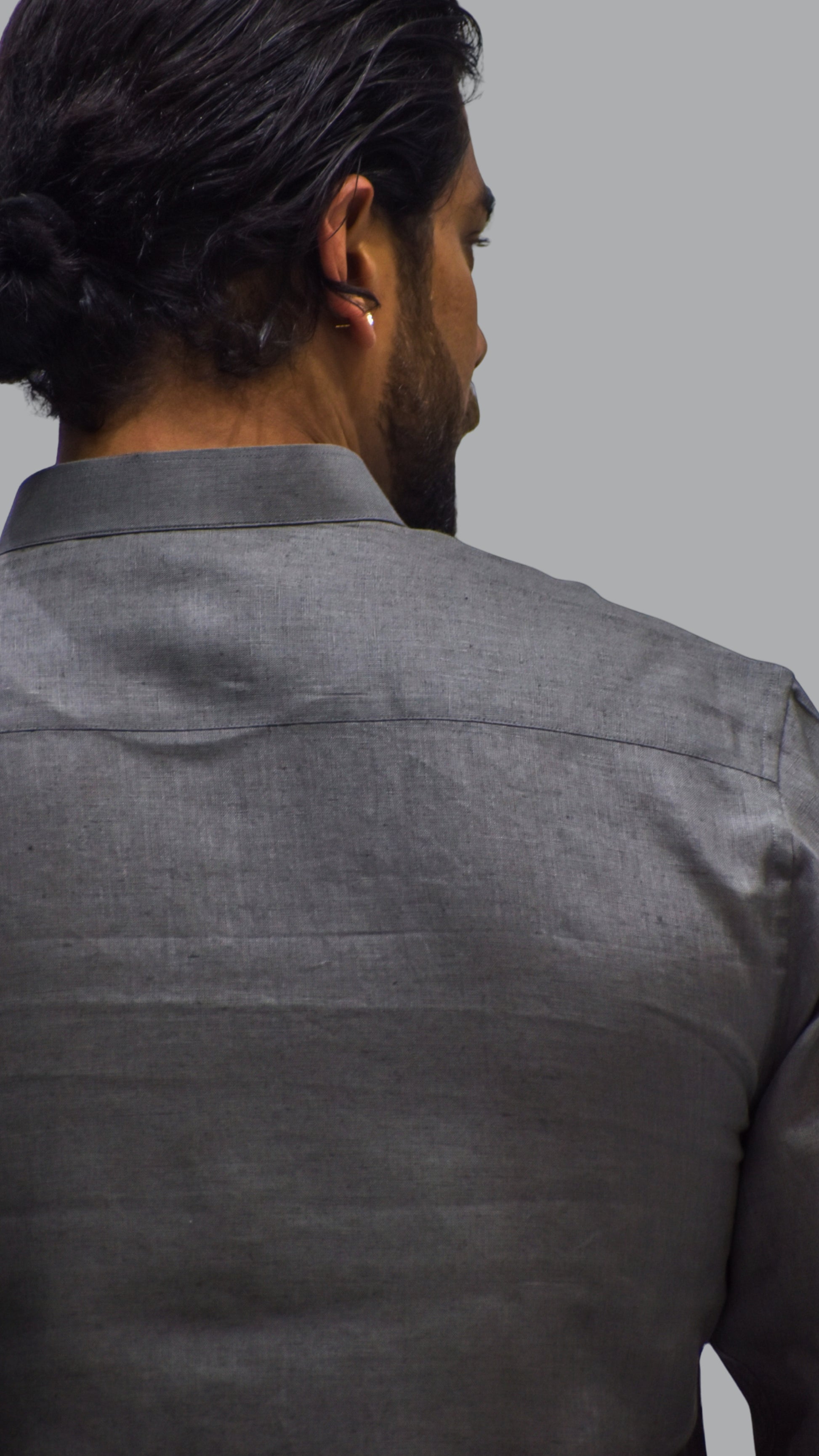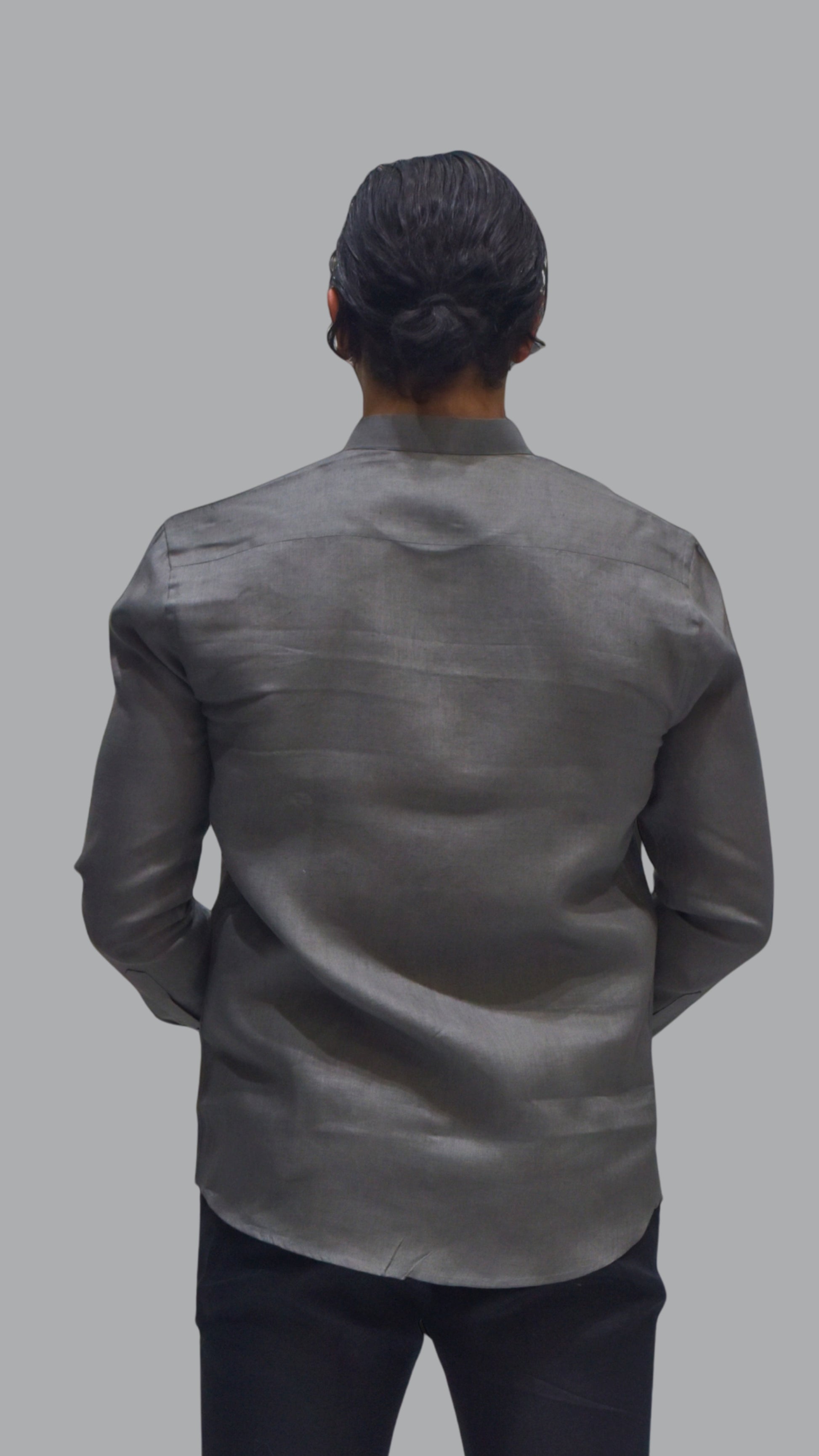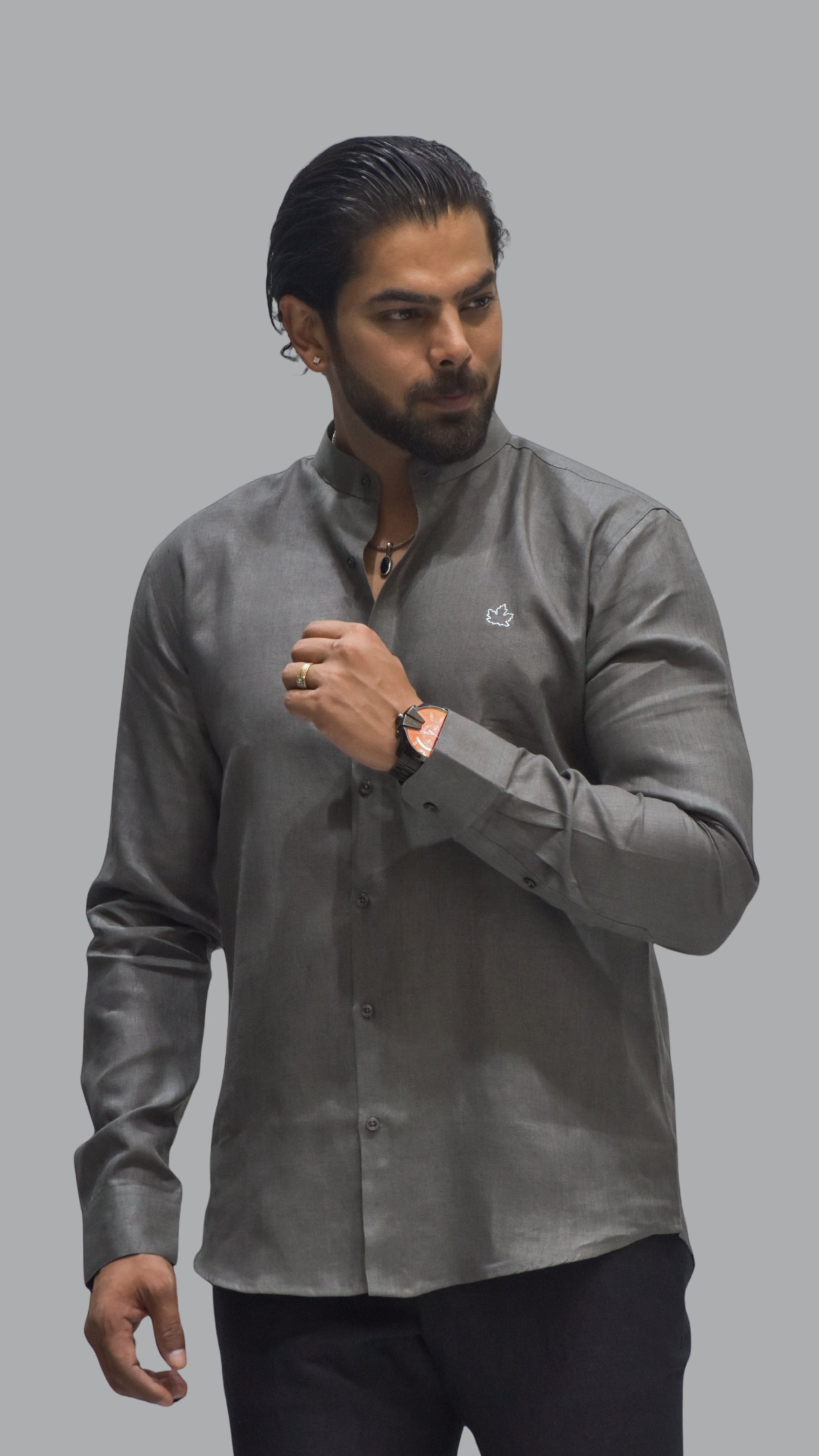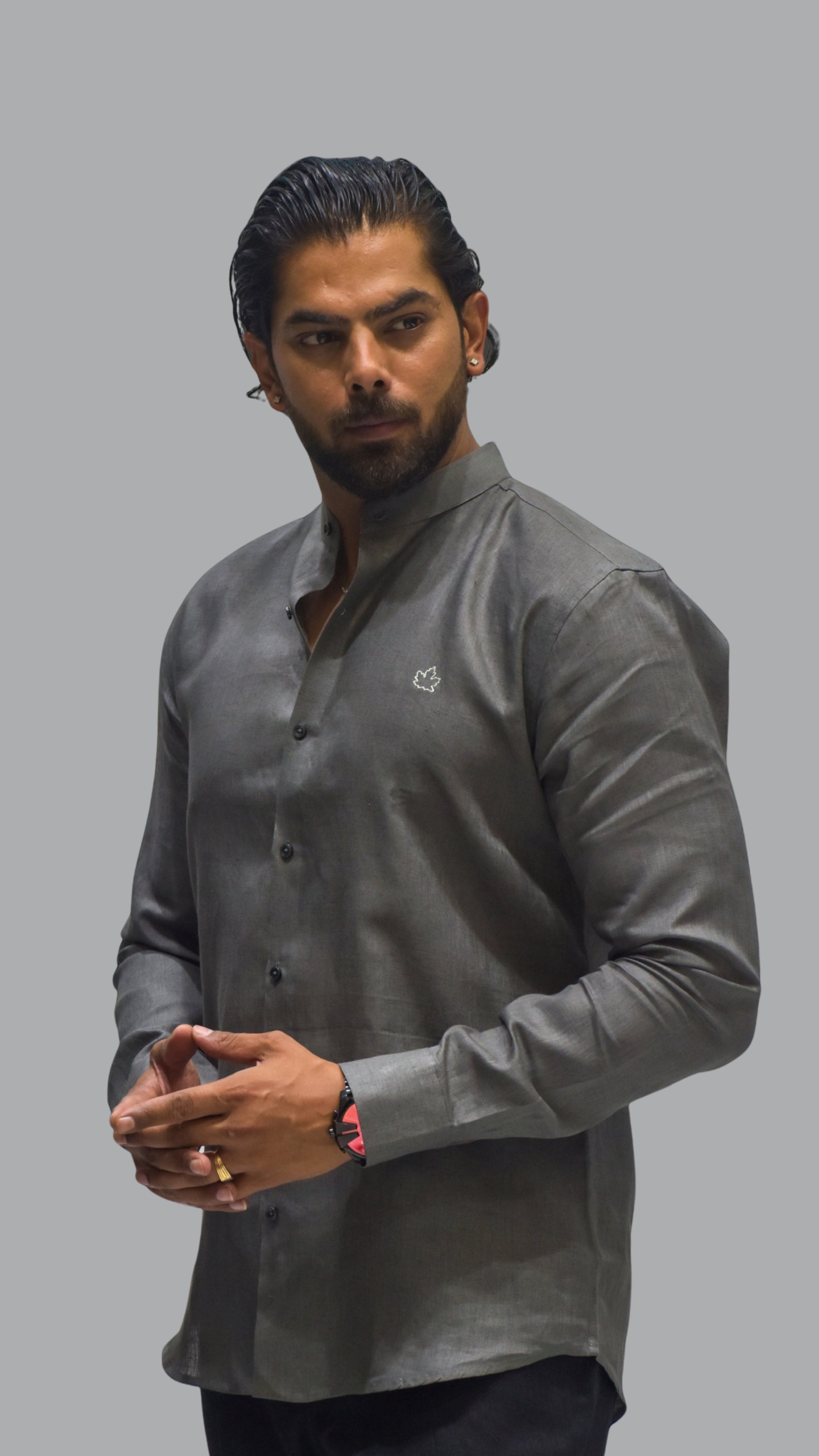 Dark grey linen with Chinese collar. A sleek, grounded essential for everyday wear.