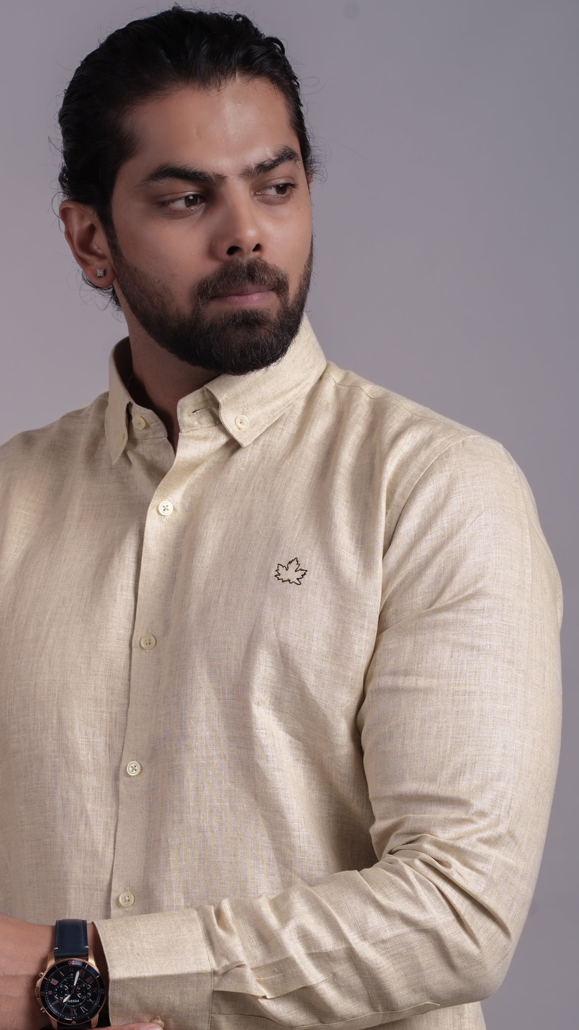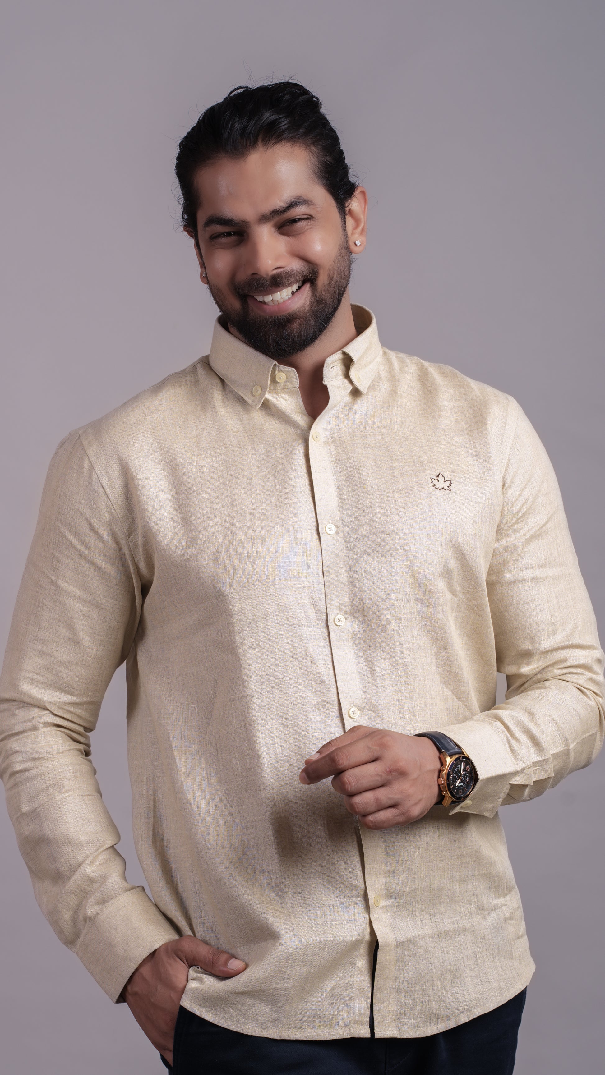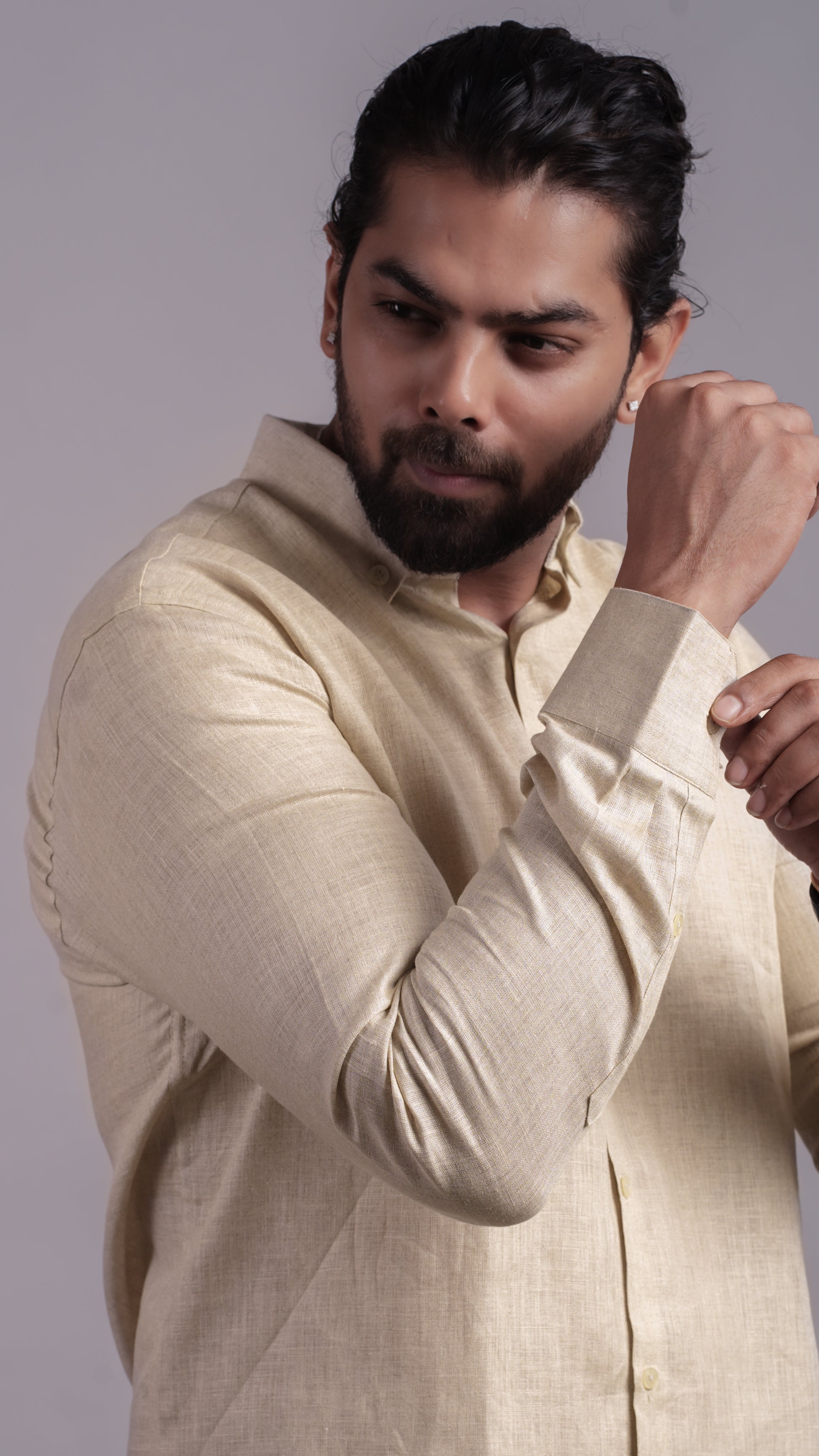 Natural beige button-collar shirt in soft linen. Understated and versatile for work or casual days.