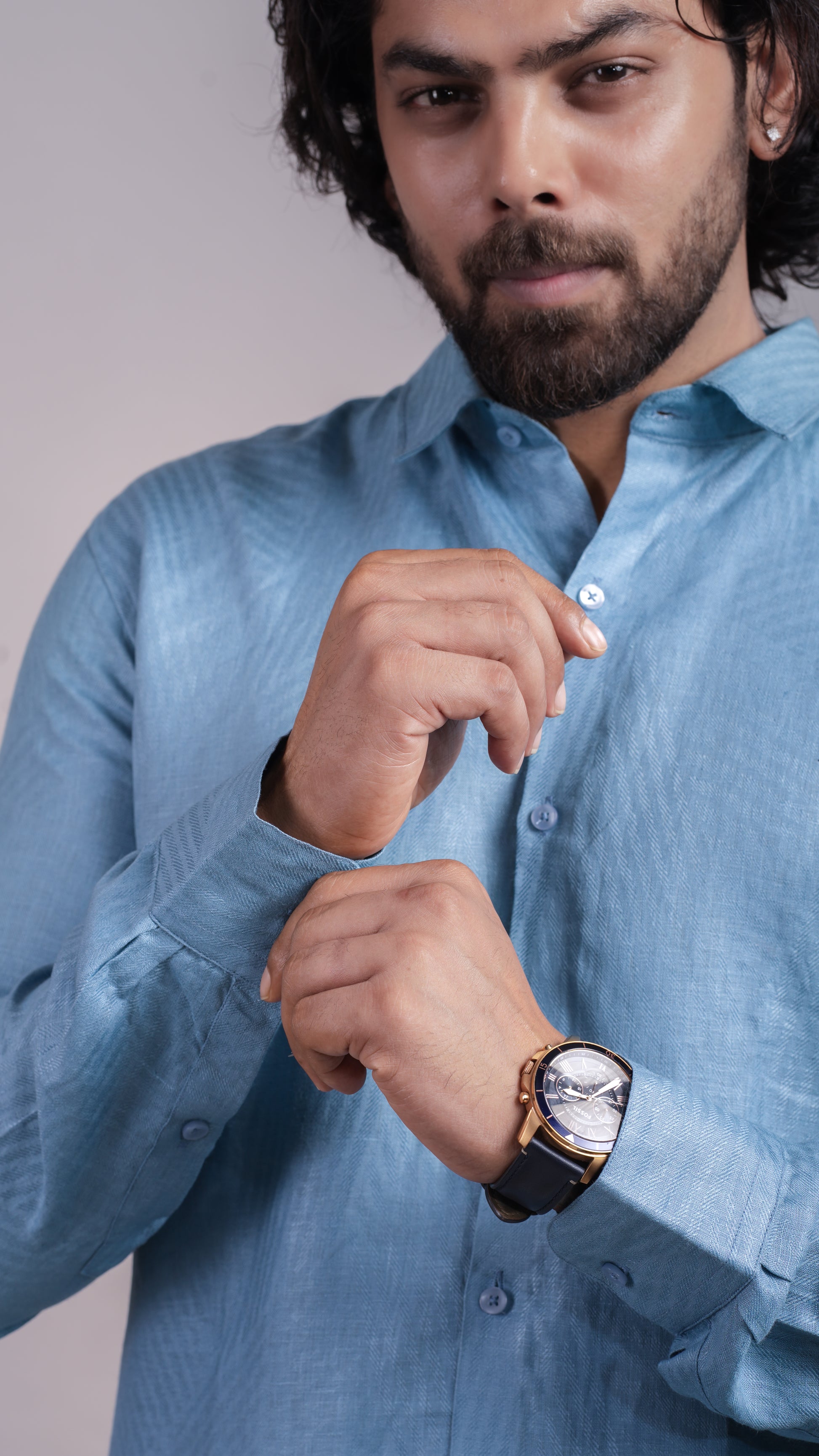 Blue jacquard full-sleeve shirt in rich linen weave. Textured luxury for evening refinement.