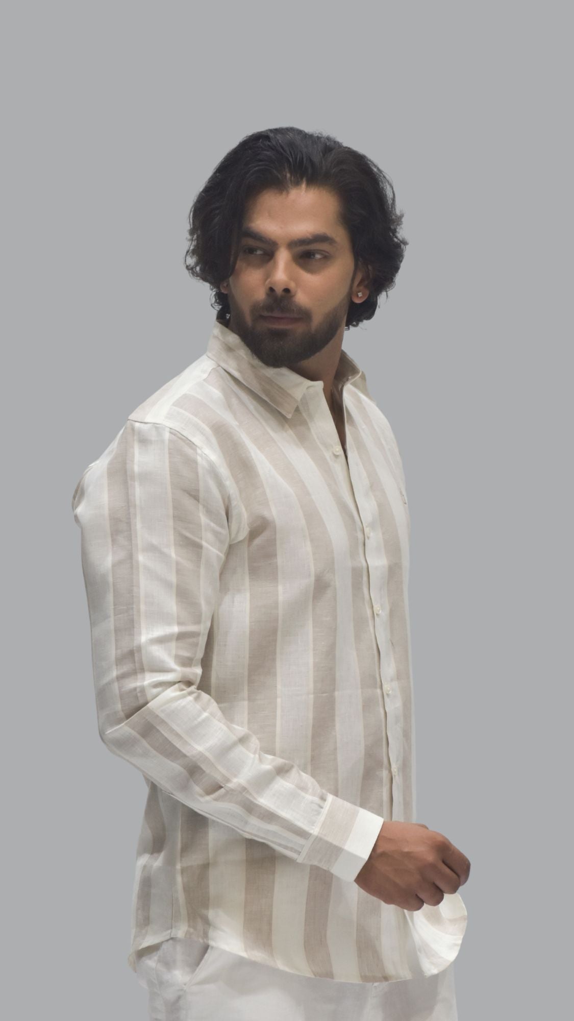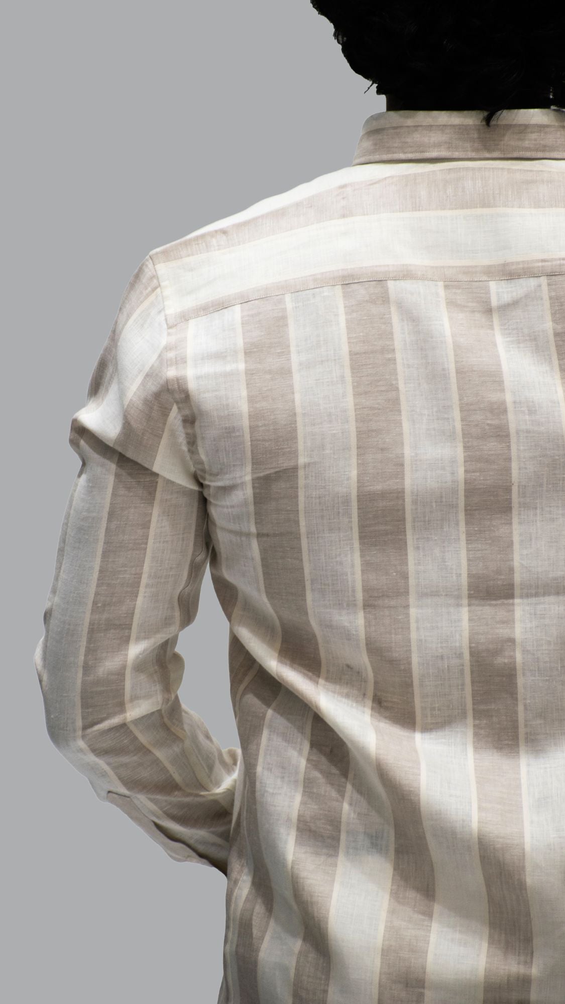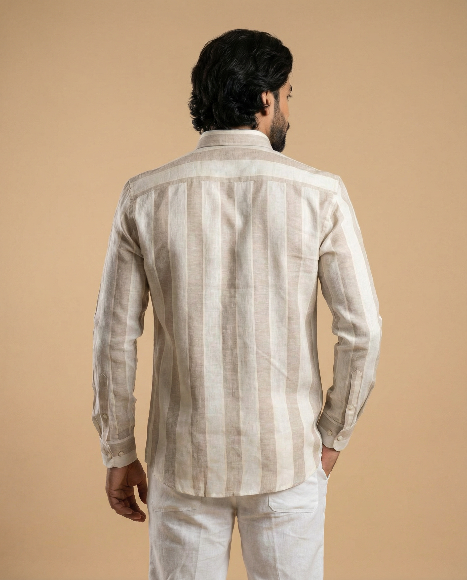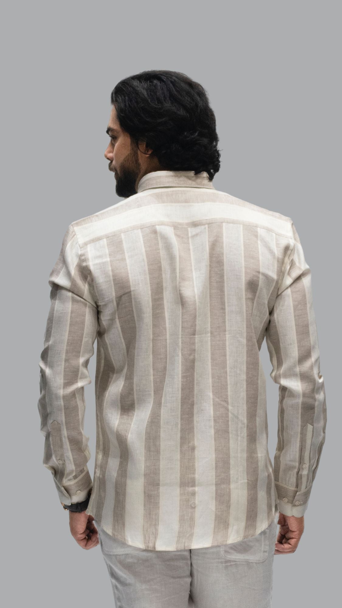 Broad striped natural beige linen shirt. Minimal yet striking, ideal for all-day wear.