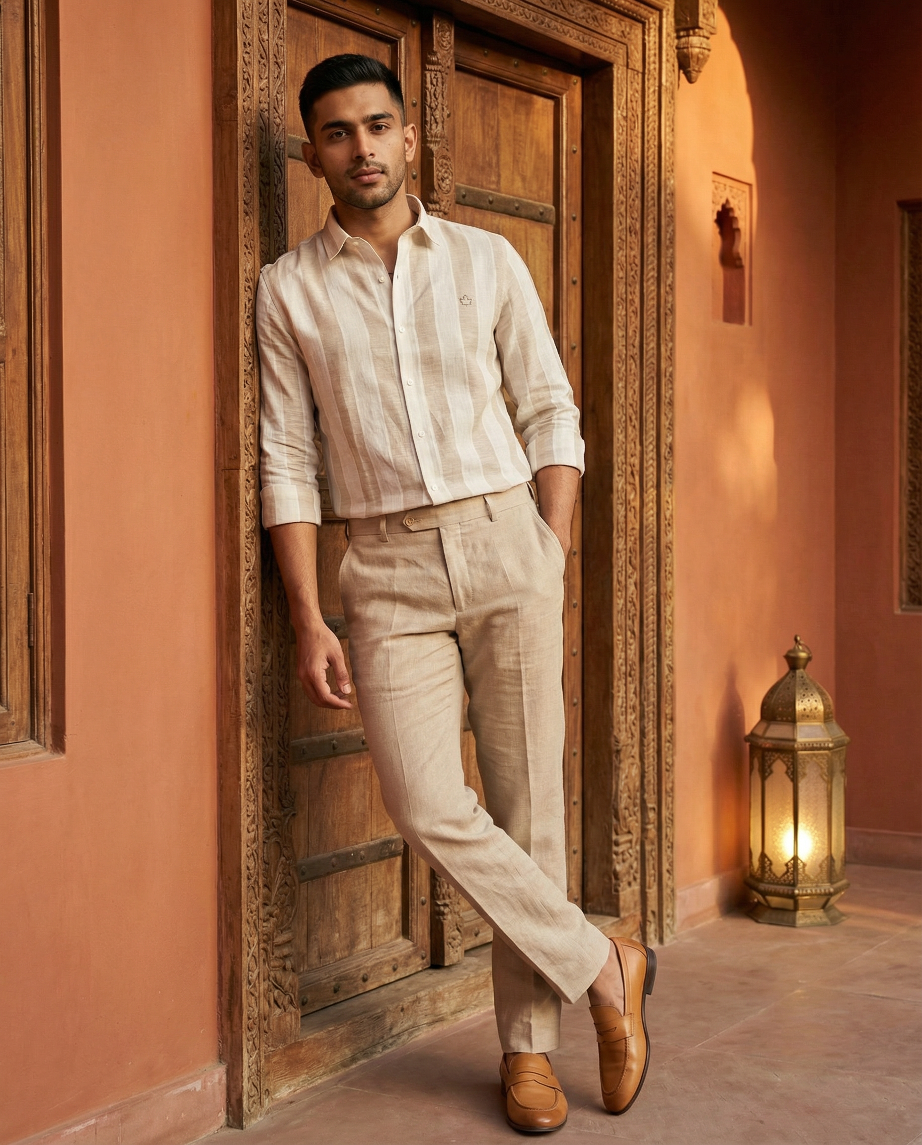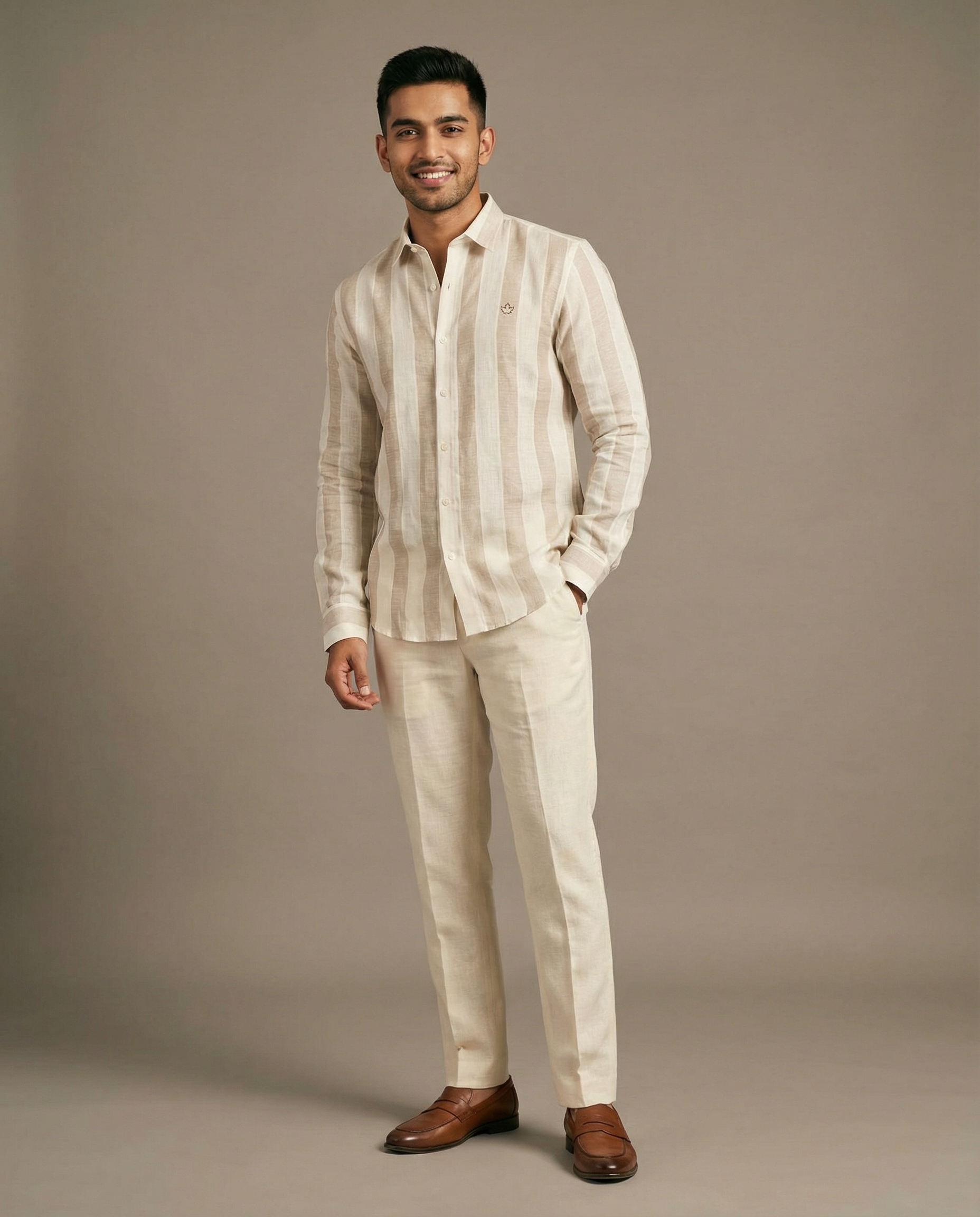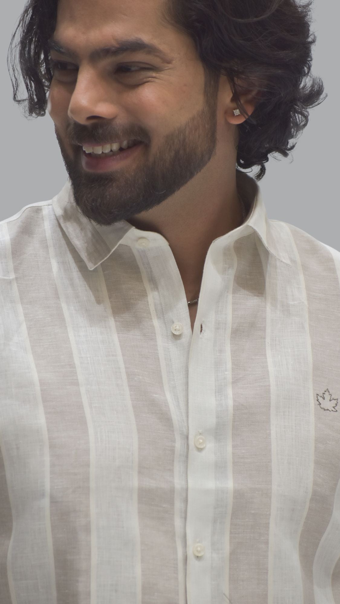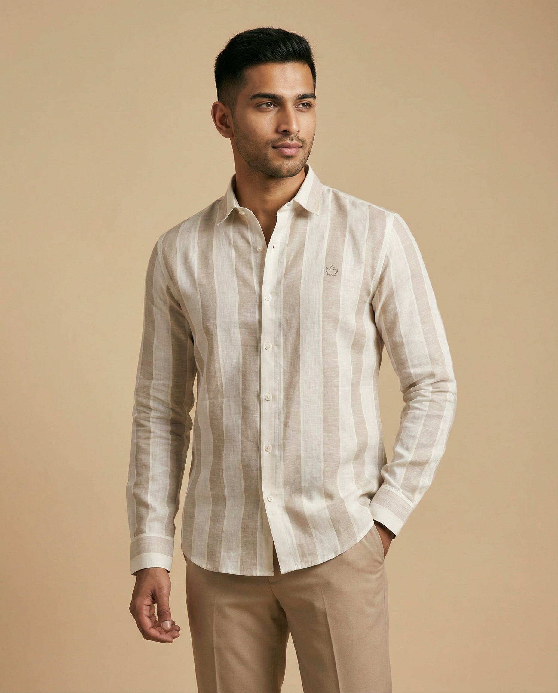 Broad striped natural beige linen shirt. Minimal yet striking, ideal for all-day wear.