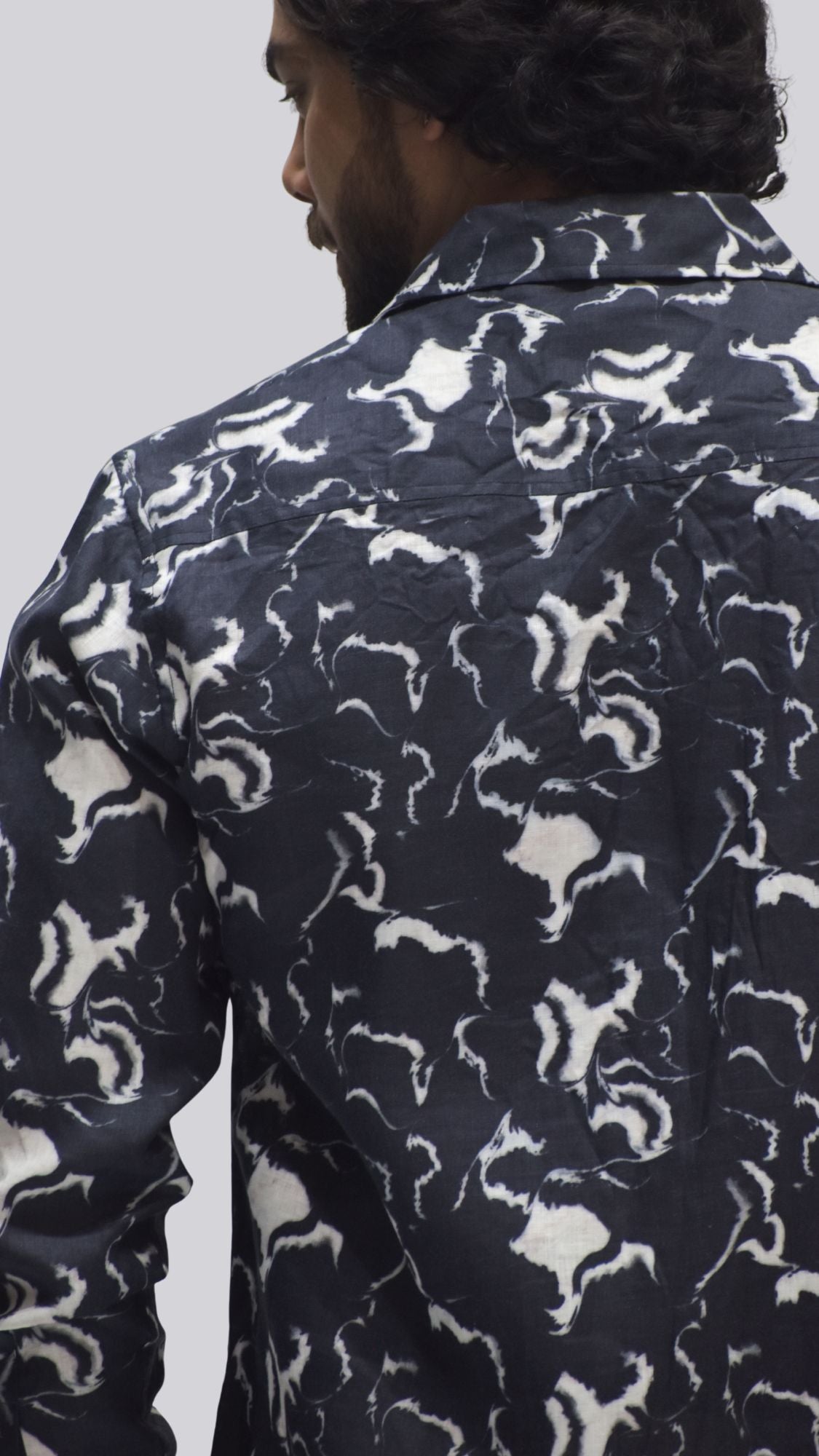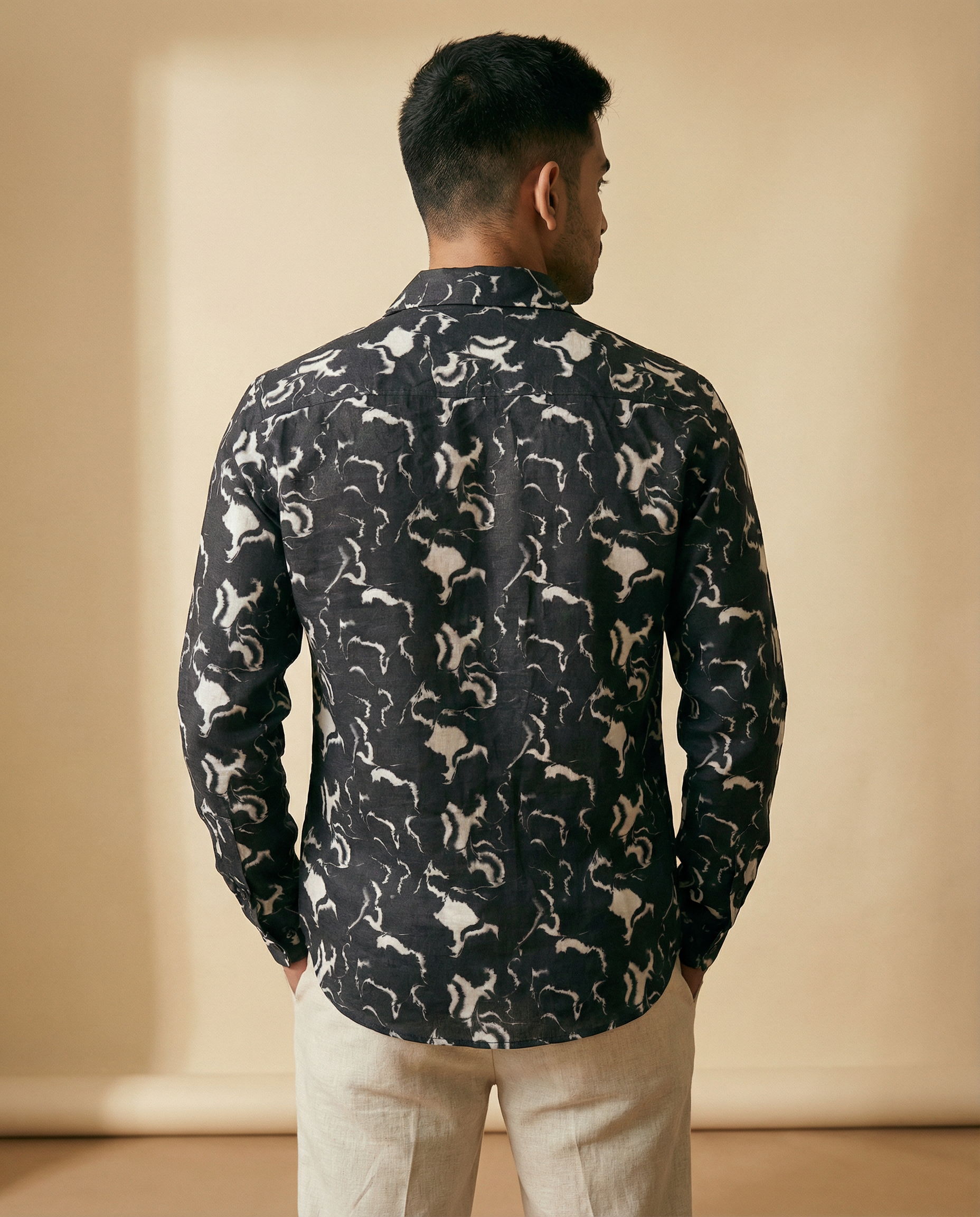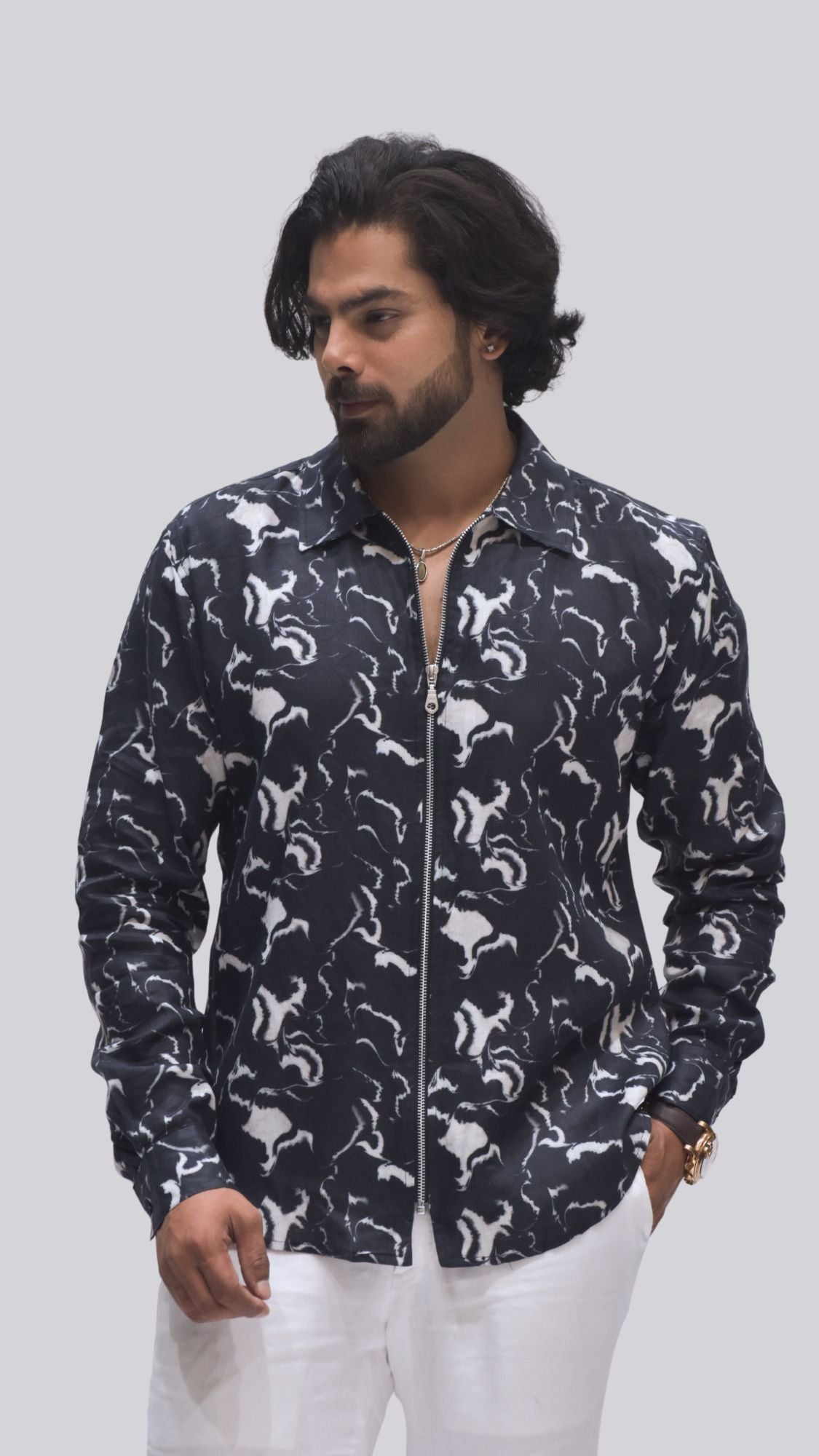Black-white digital print linen shirt. A modern monochrome piece with artistic depth