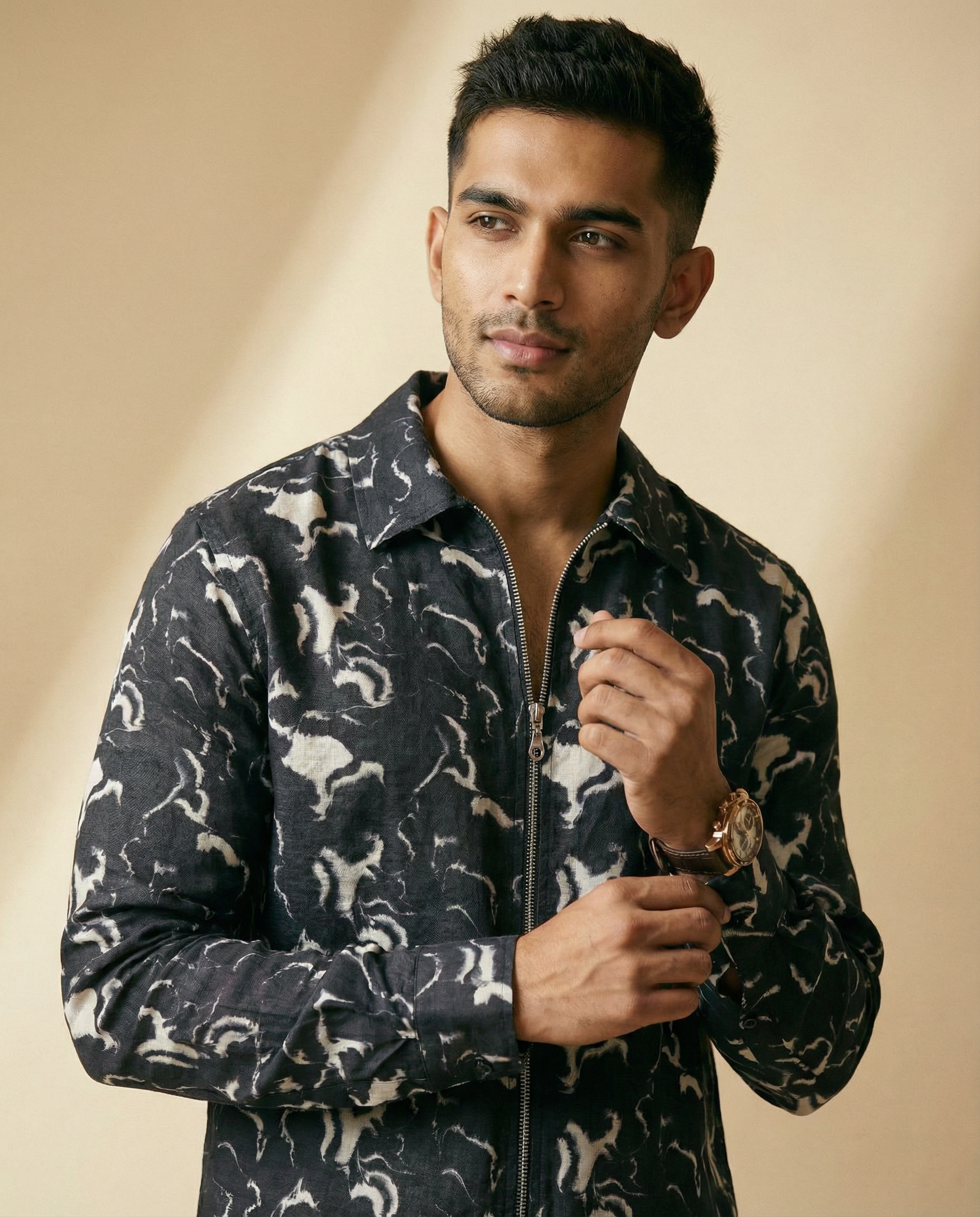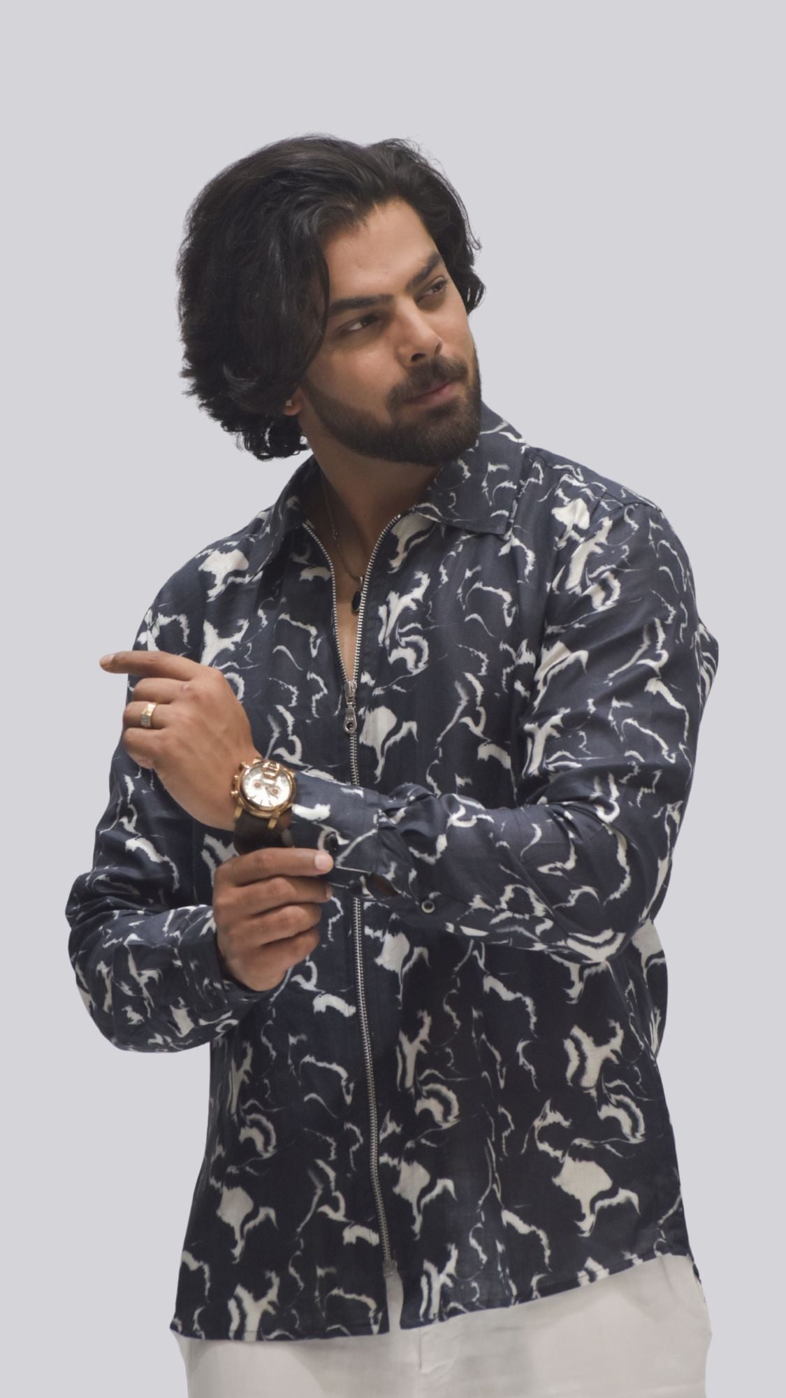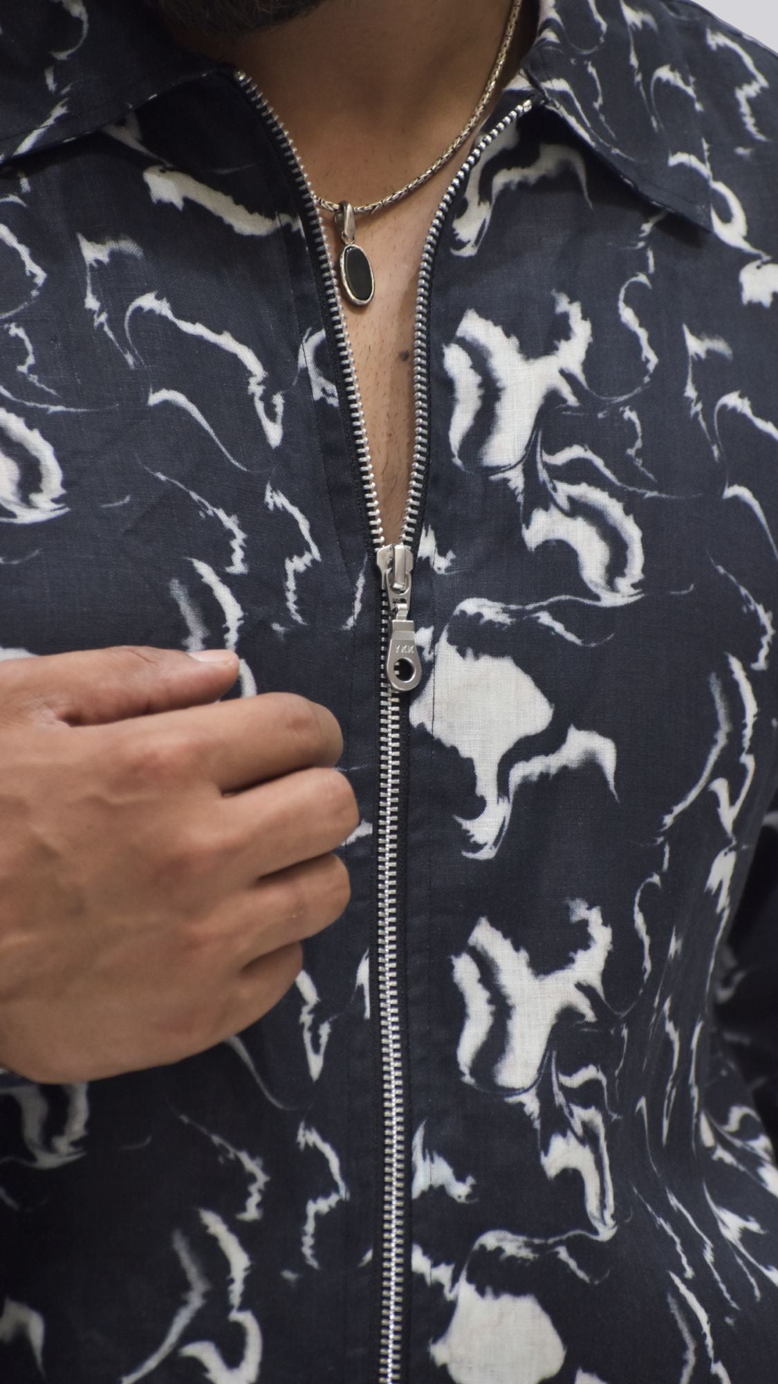 Black-white digital print linen shirt. A modern monochrome piece with artistic depth