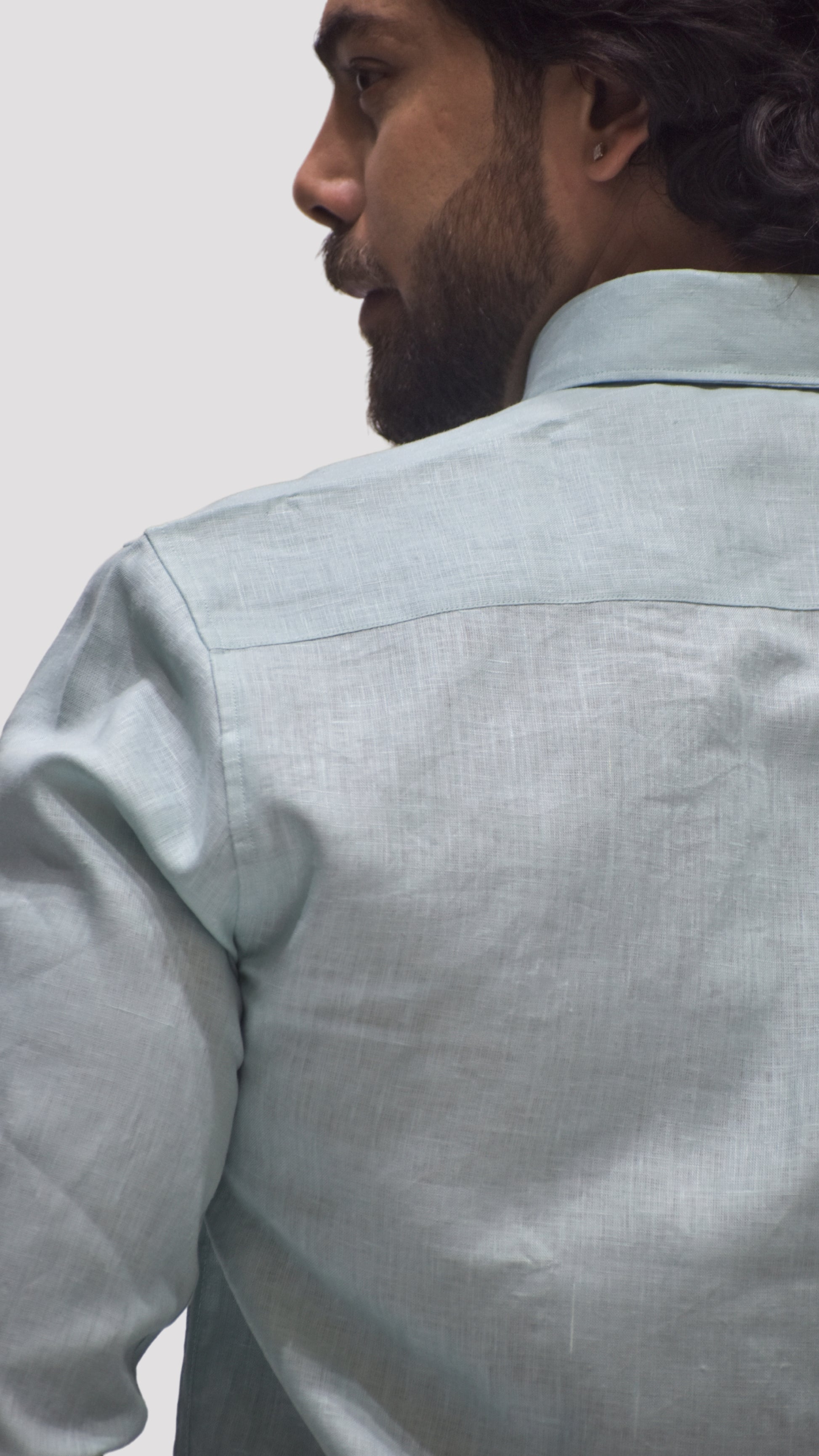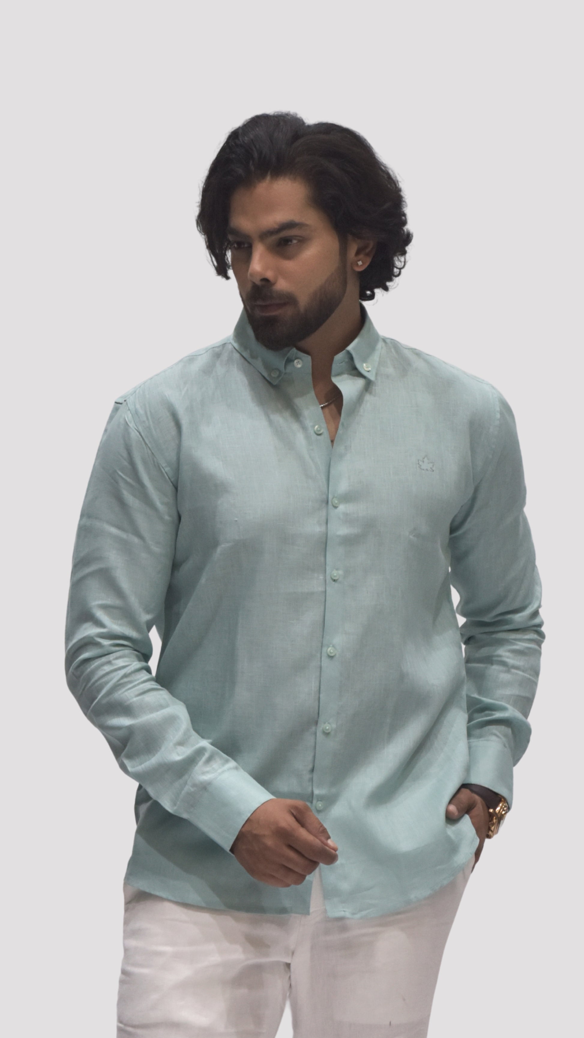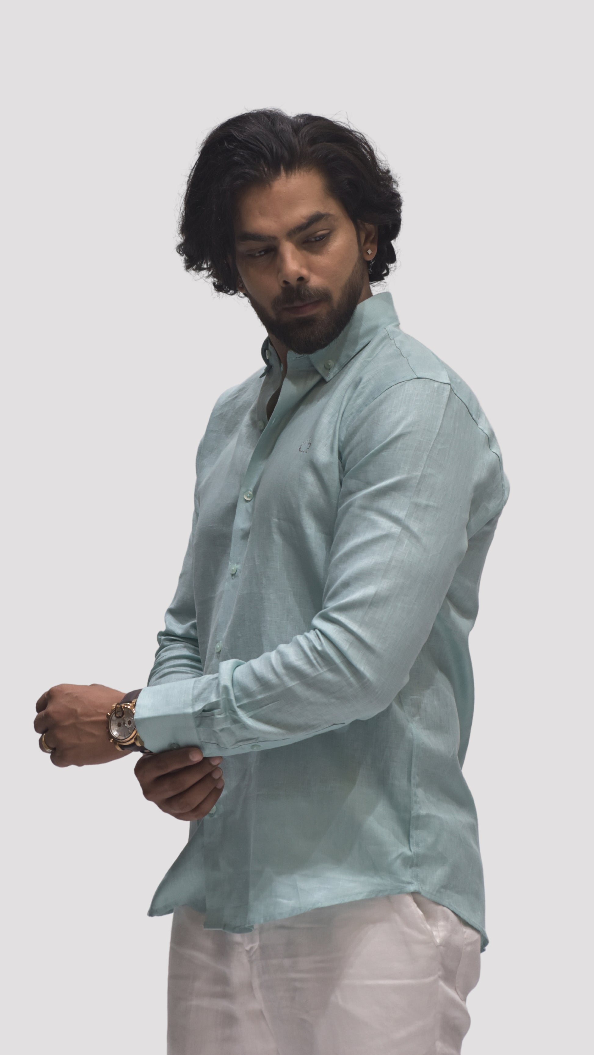 Sea blue button-collar shirt in pure linen. Calm, refreshing, and effortlessly elegant.