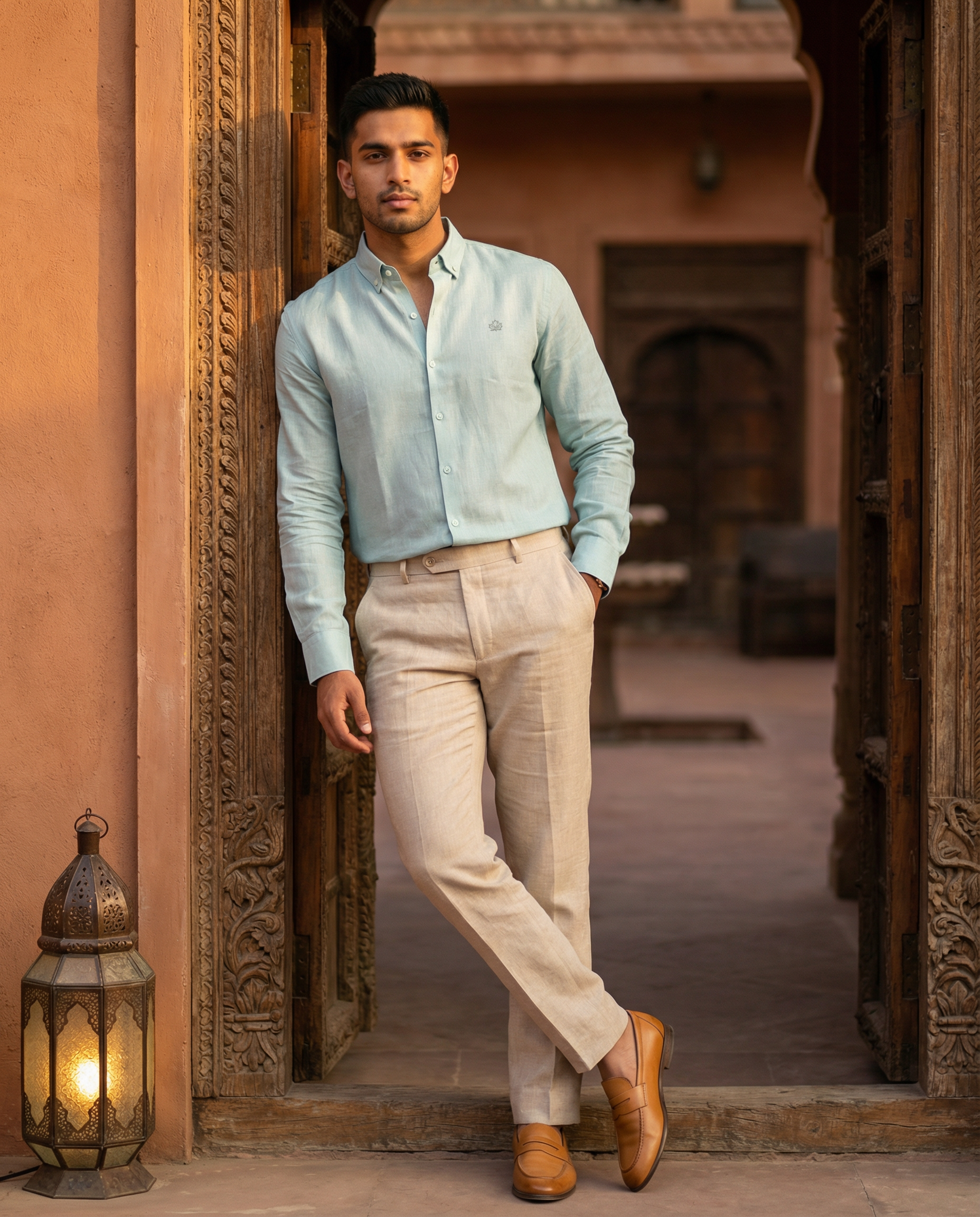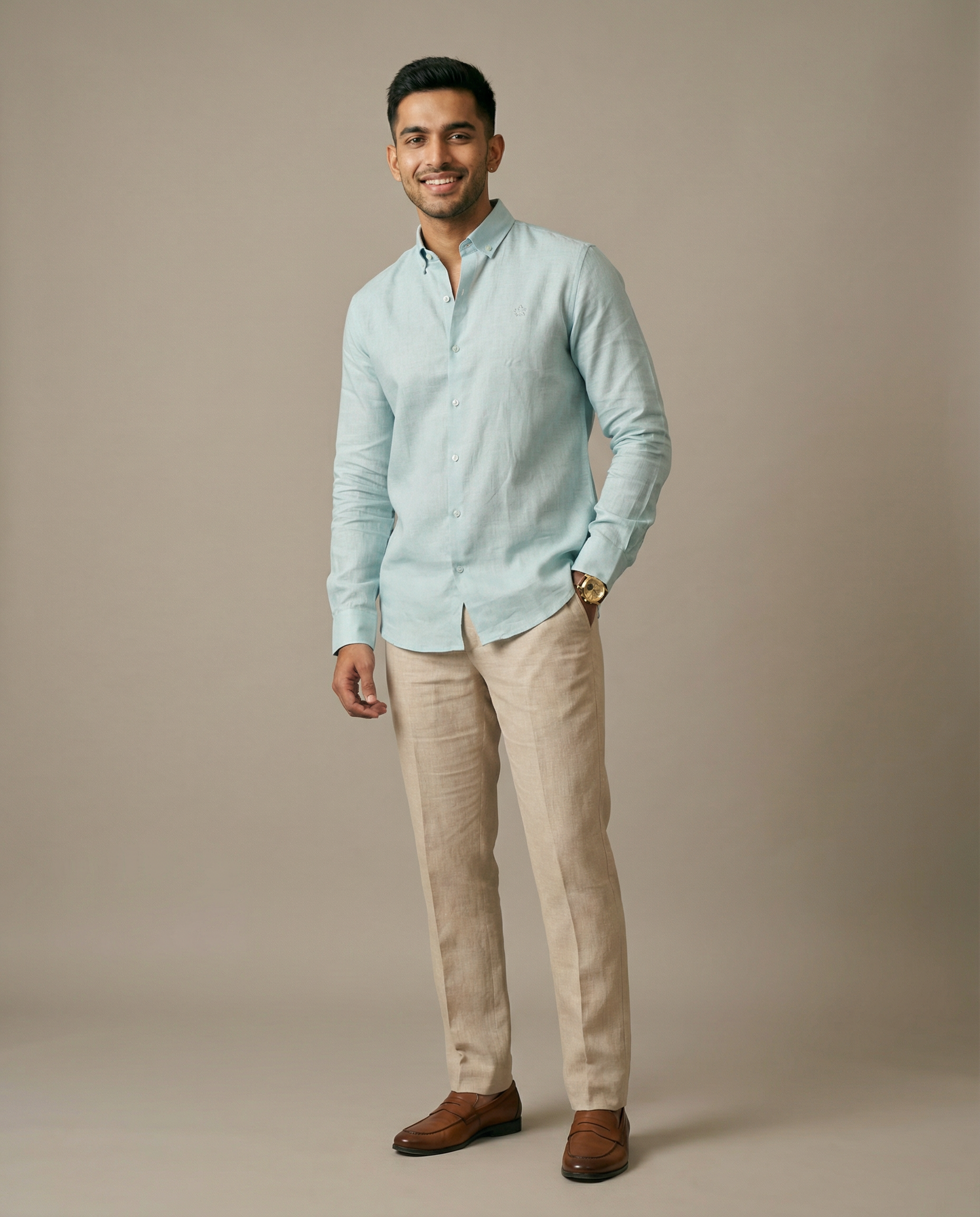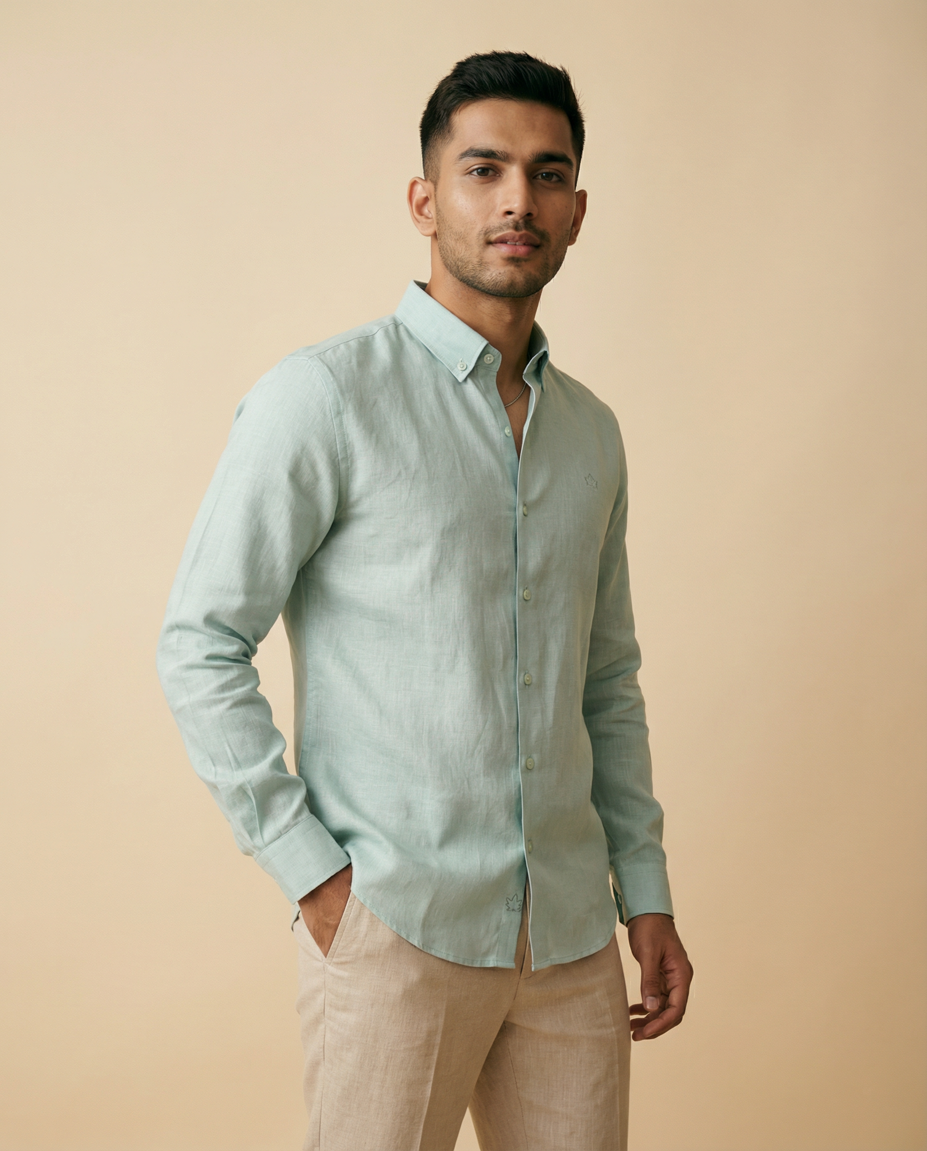 Sea blue button-collar shirt in pure linen. Calm, refreshing, and effortlessly elegant.