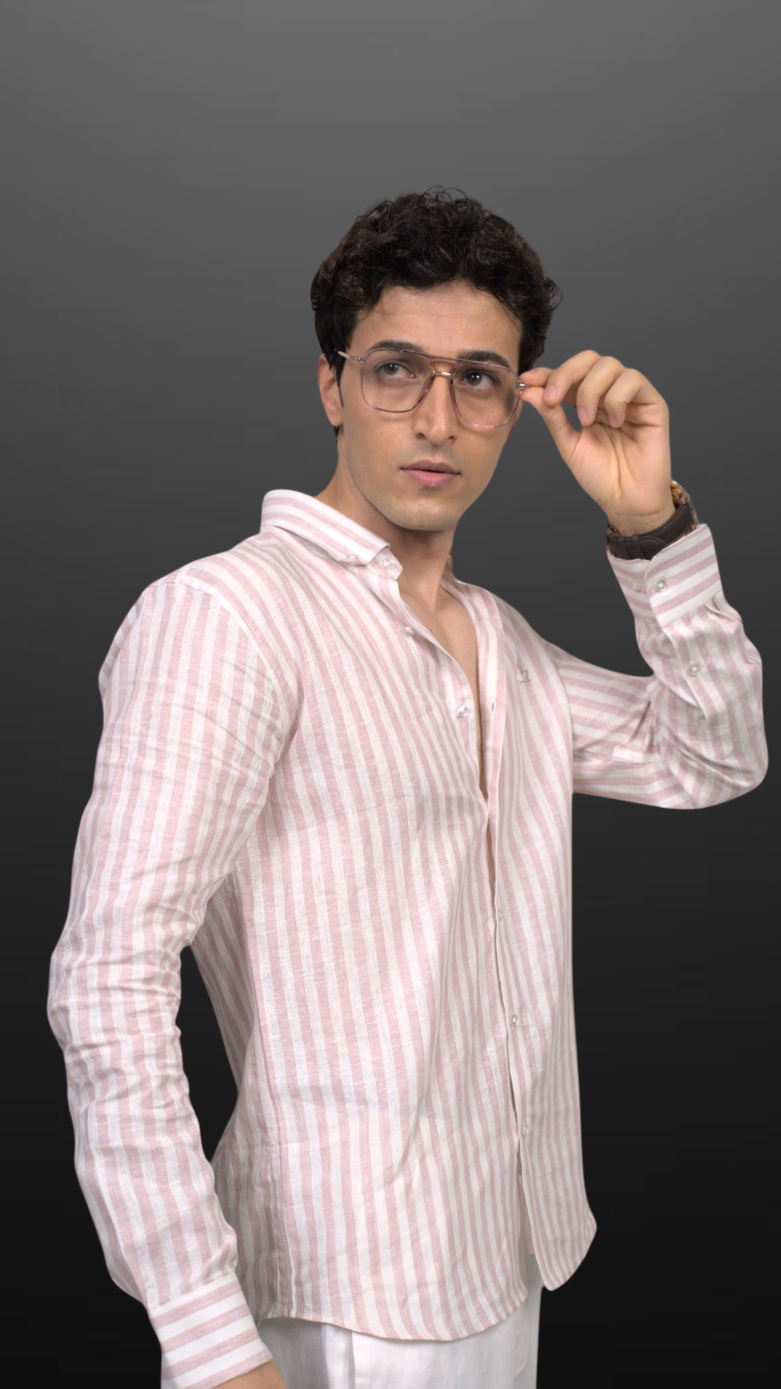 Muted rose and white striped linen shirt. Relaxed yet refined, bringing a breezy elegance to everyday wear.