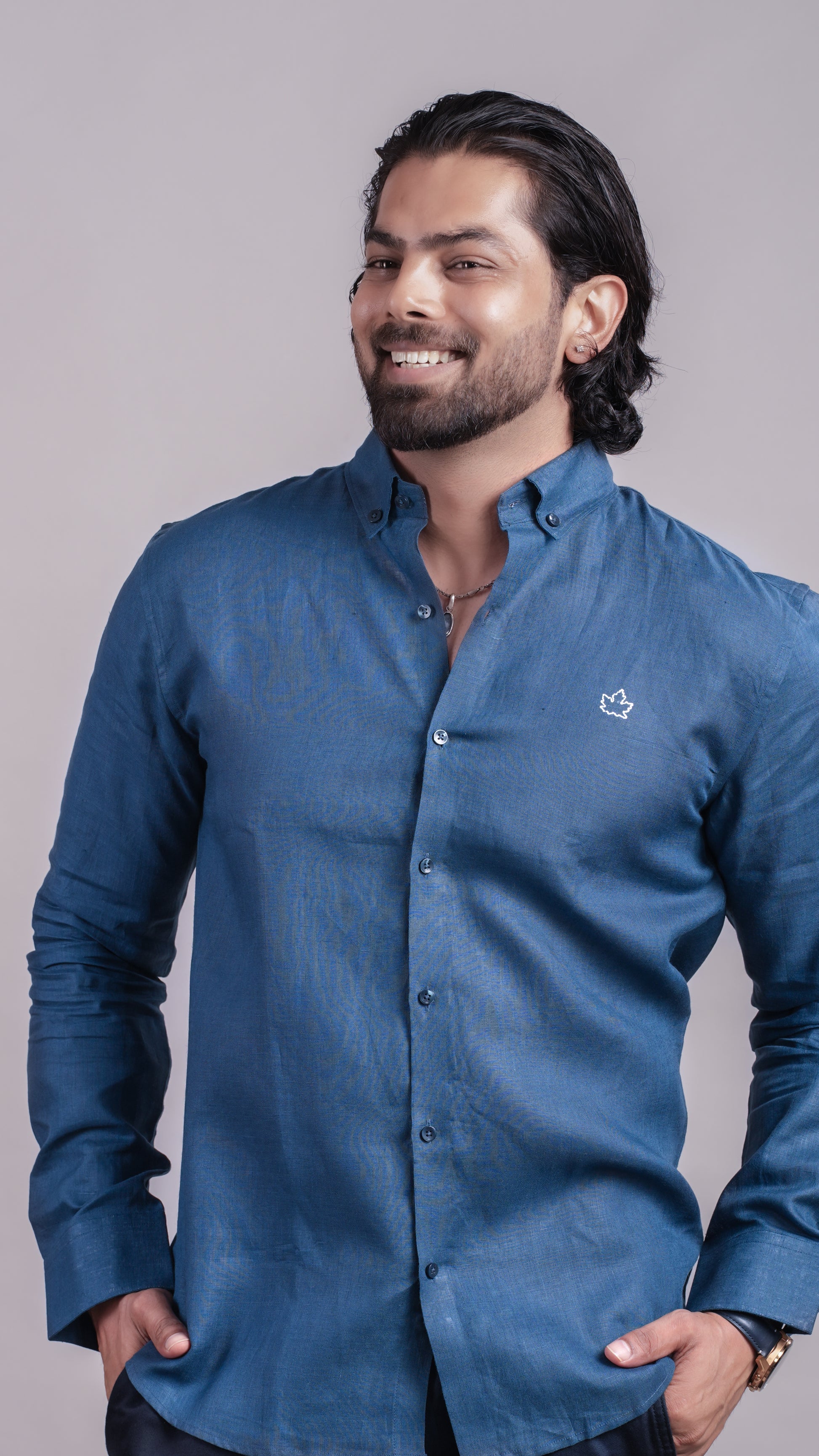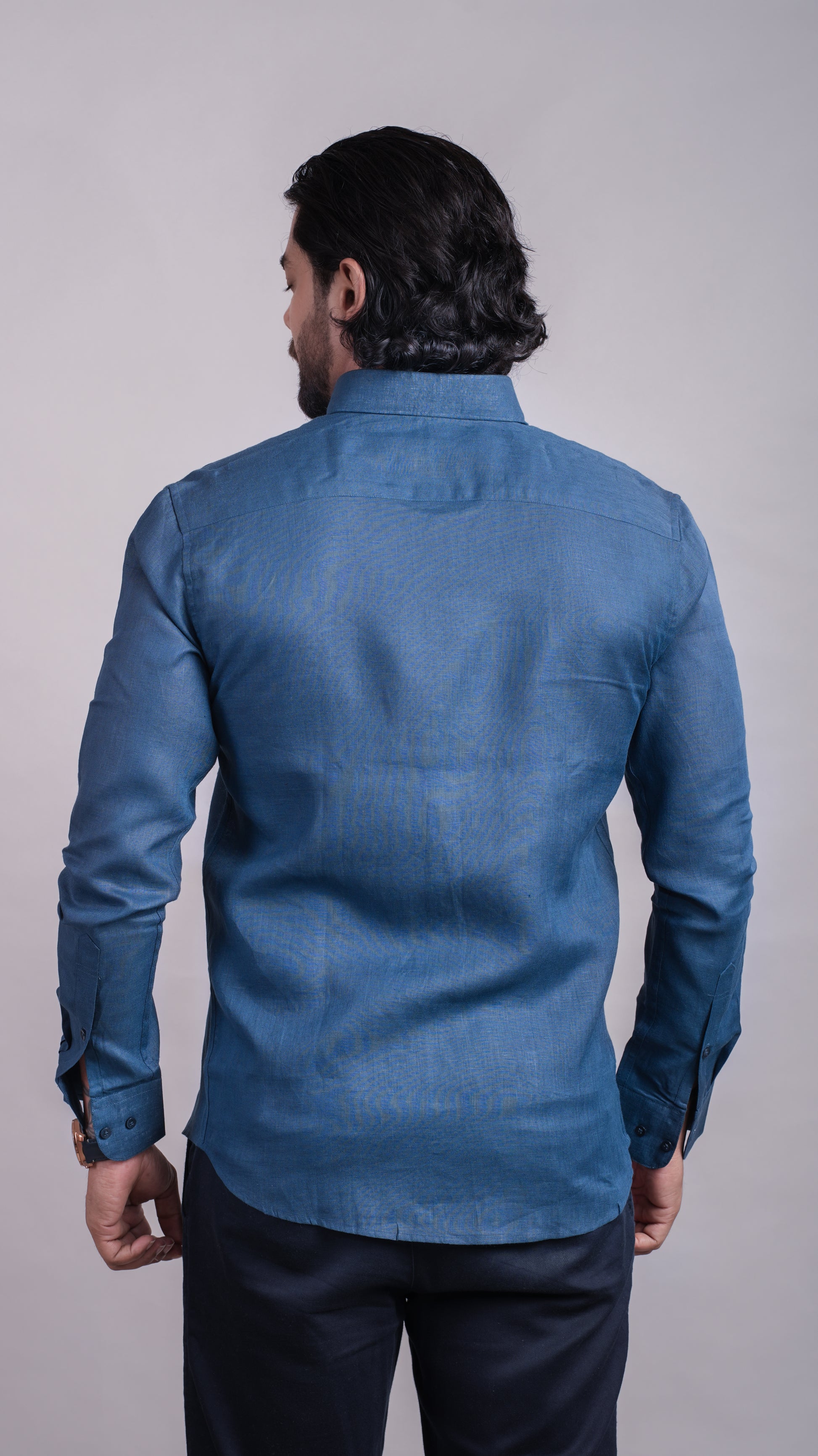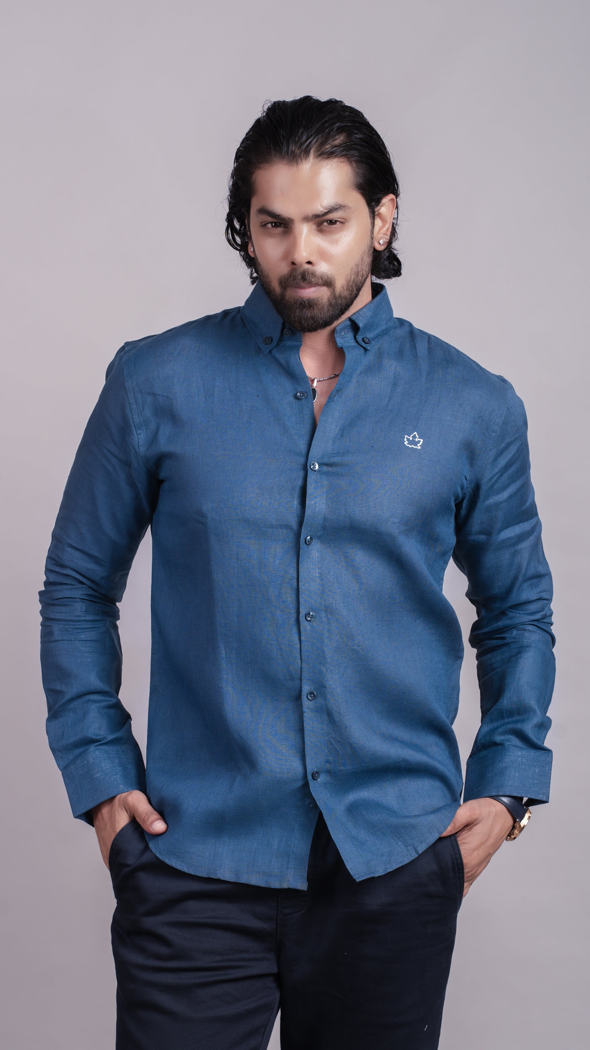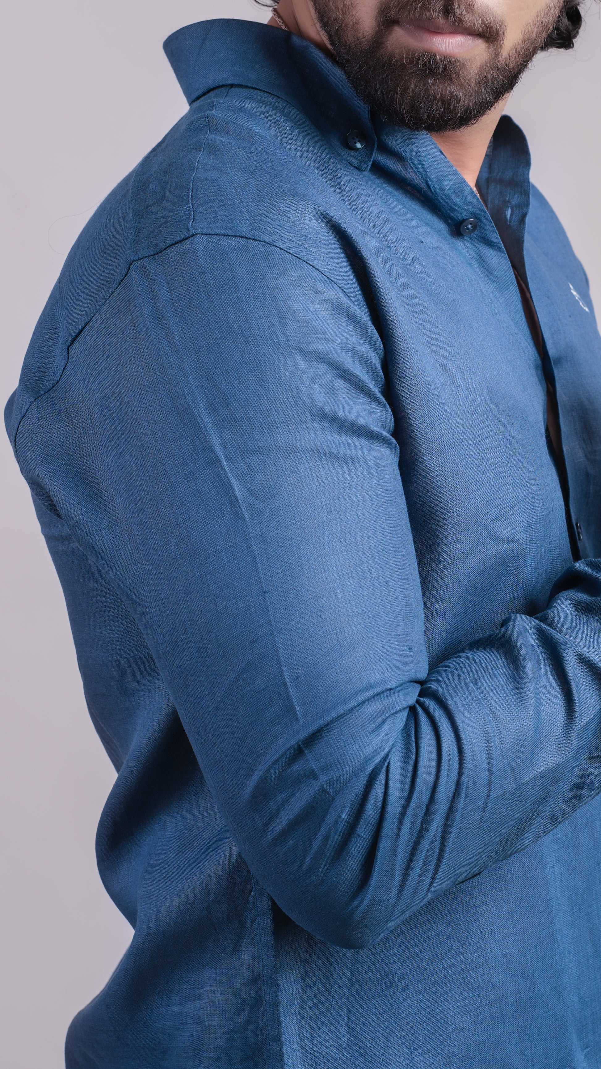 Deep royal blue linen shirt with button collar. Bold, confident, and made to stand out.