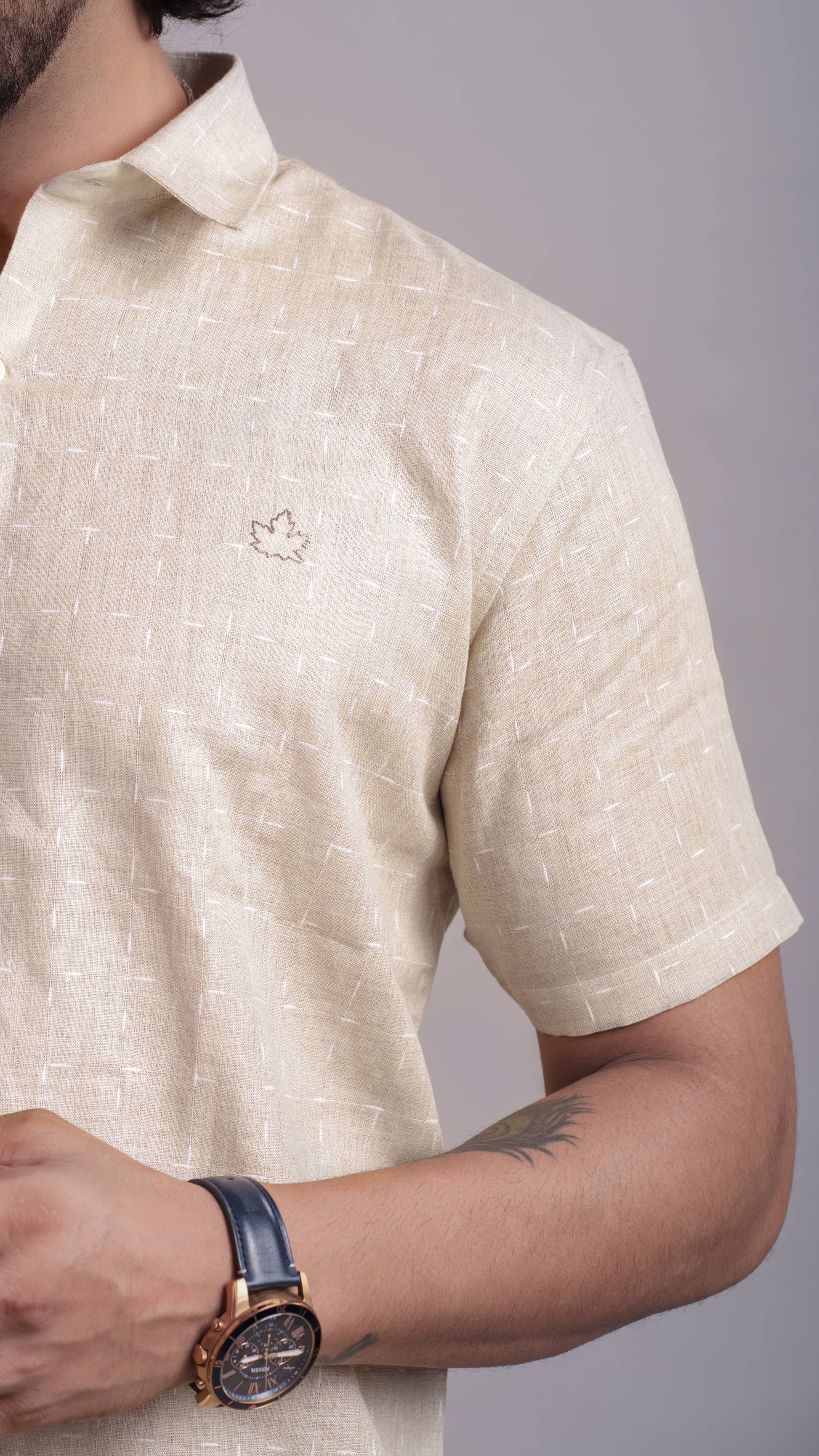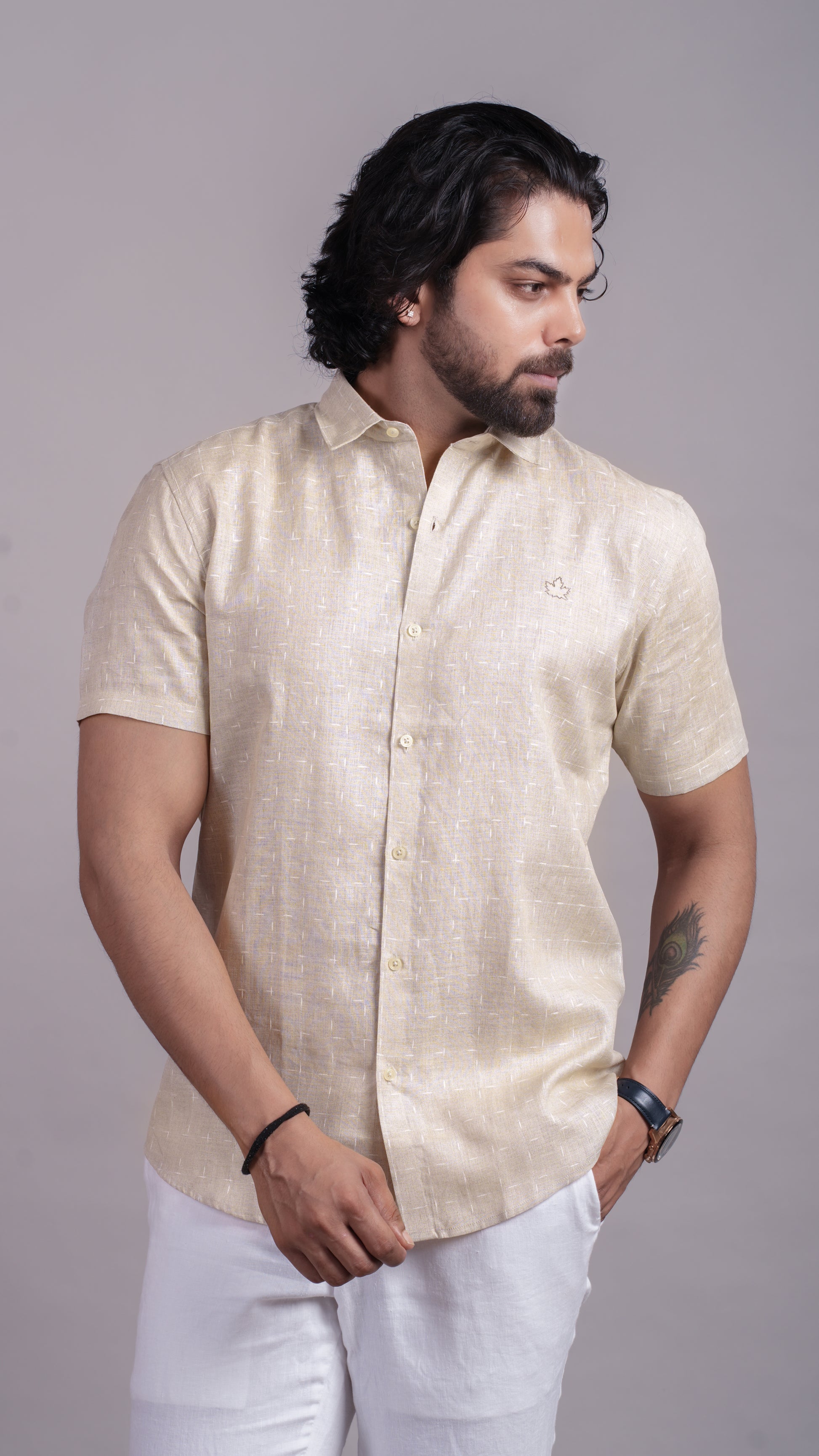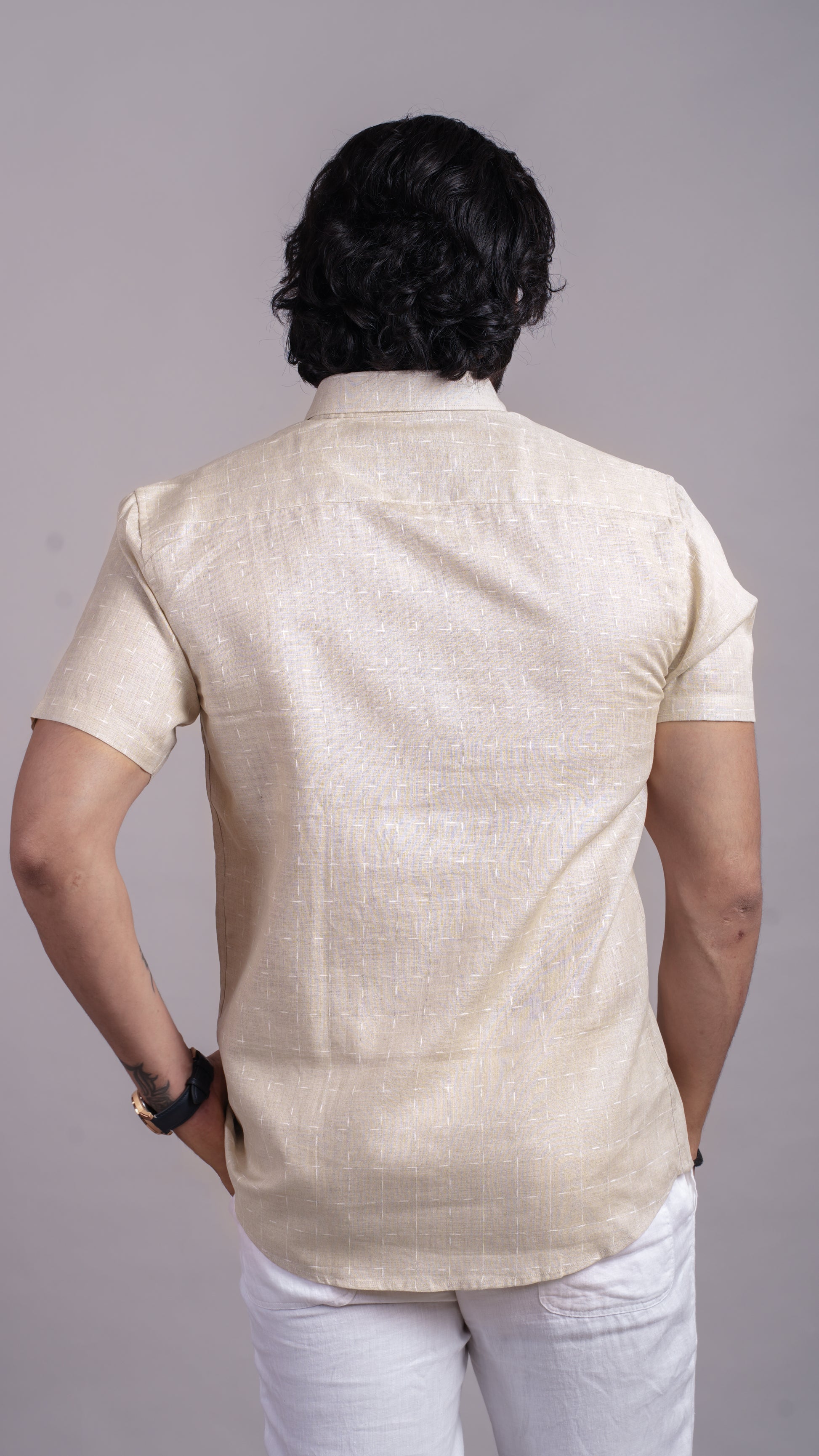 Beige-white chex pattern in linen, blending subtle texture with timeless comfort. A smart casual staple.