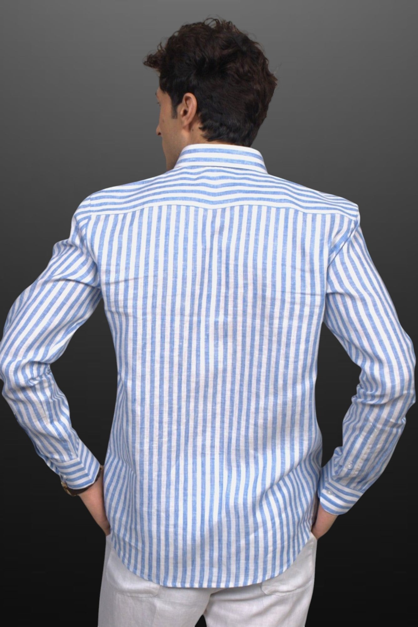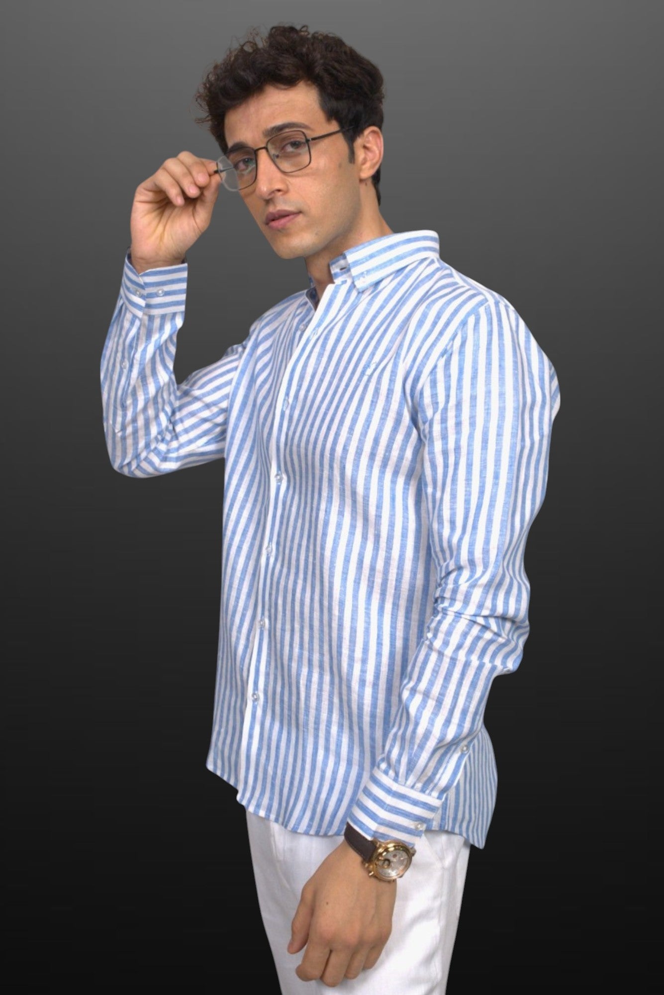 Blue striped linen shirt with a button collar. Light yet distinctive, perfect for smart casual dressing.
