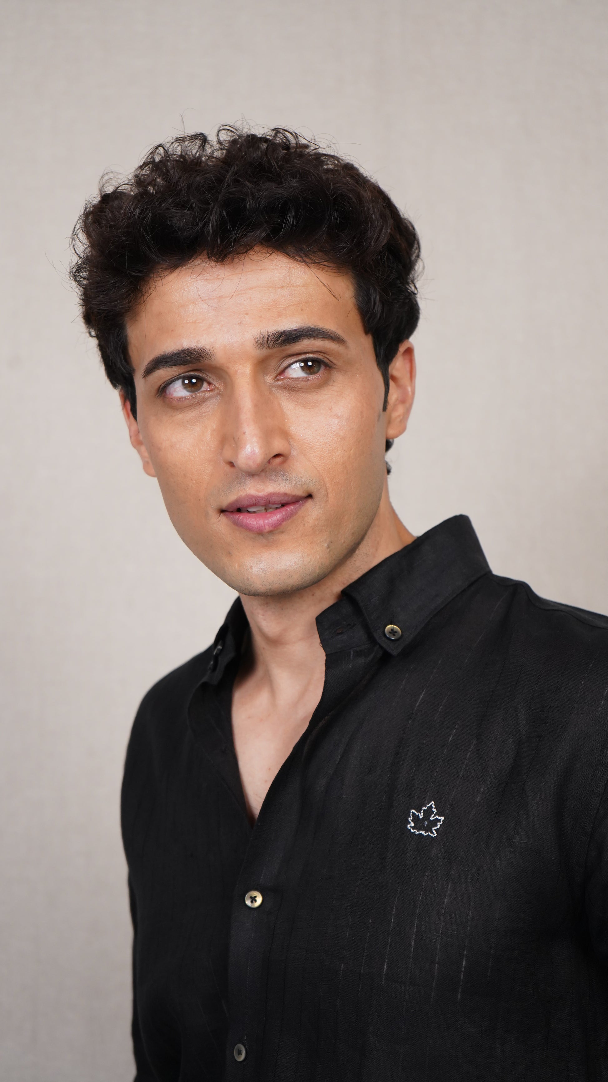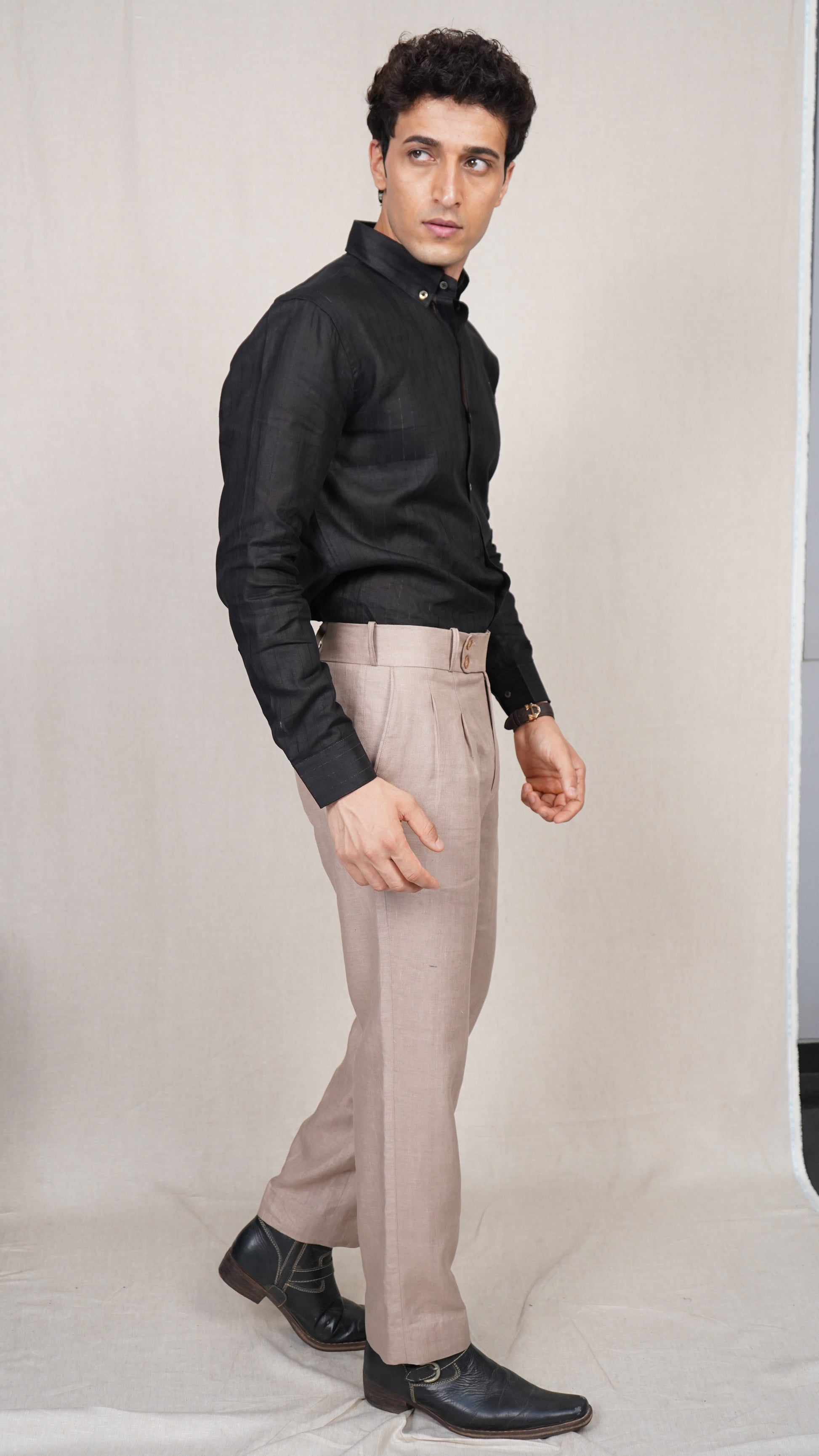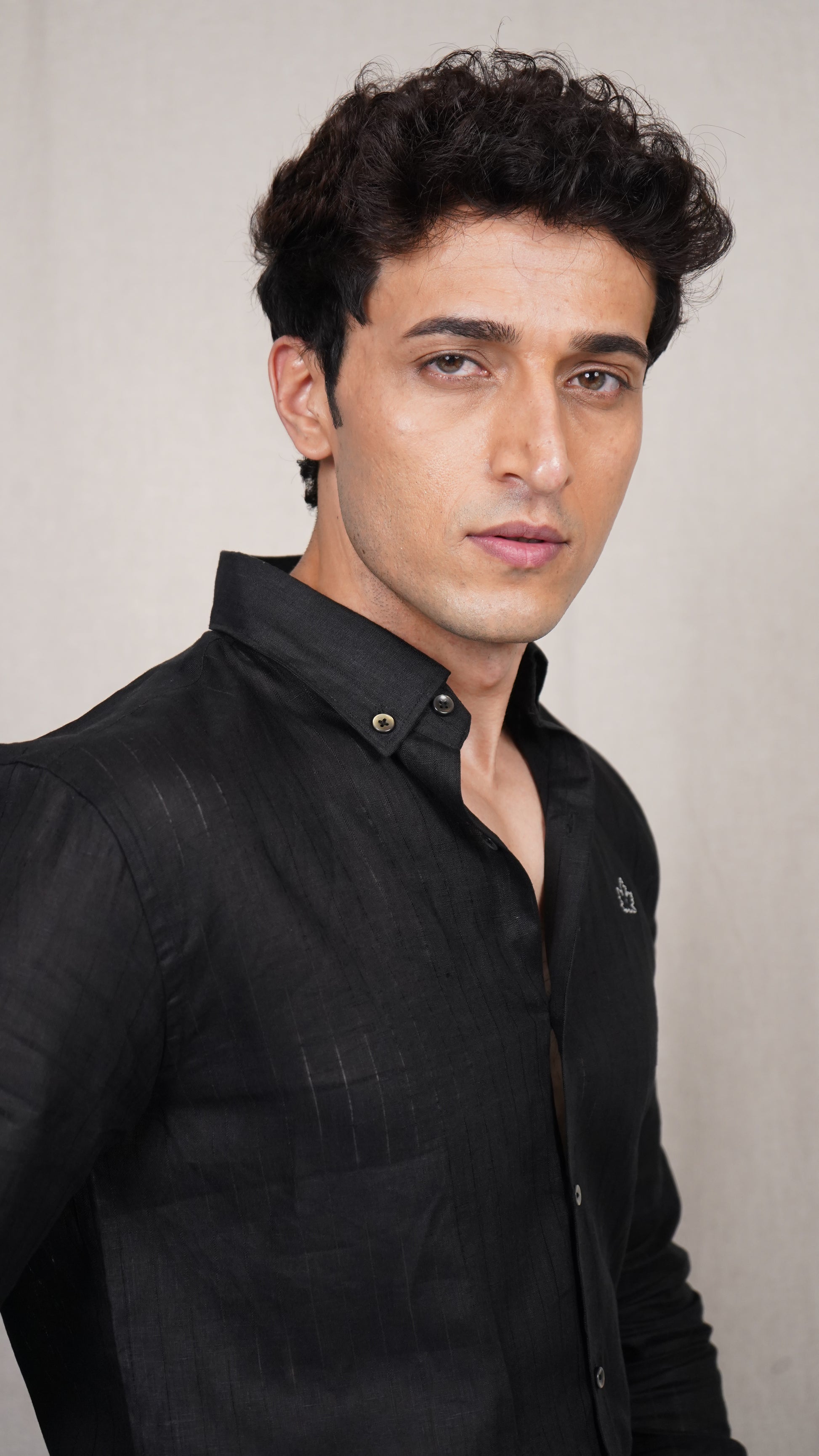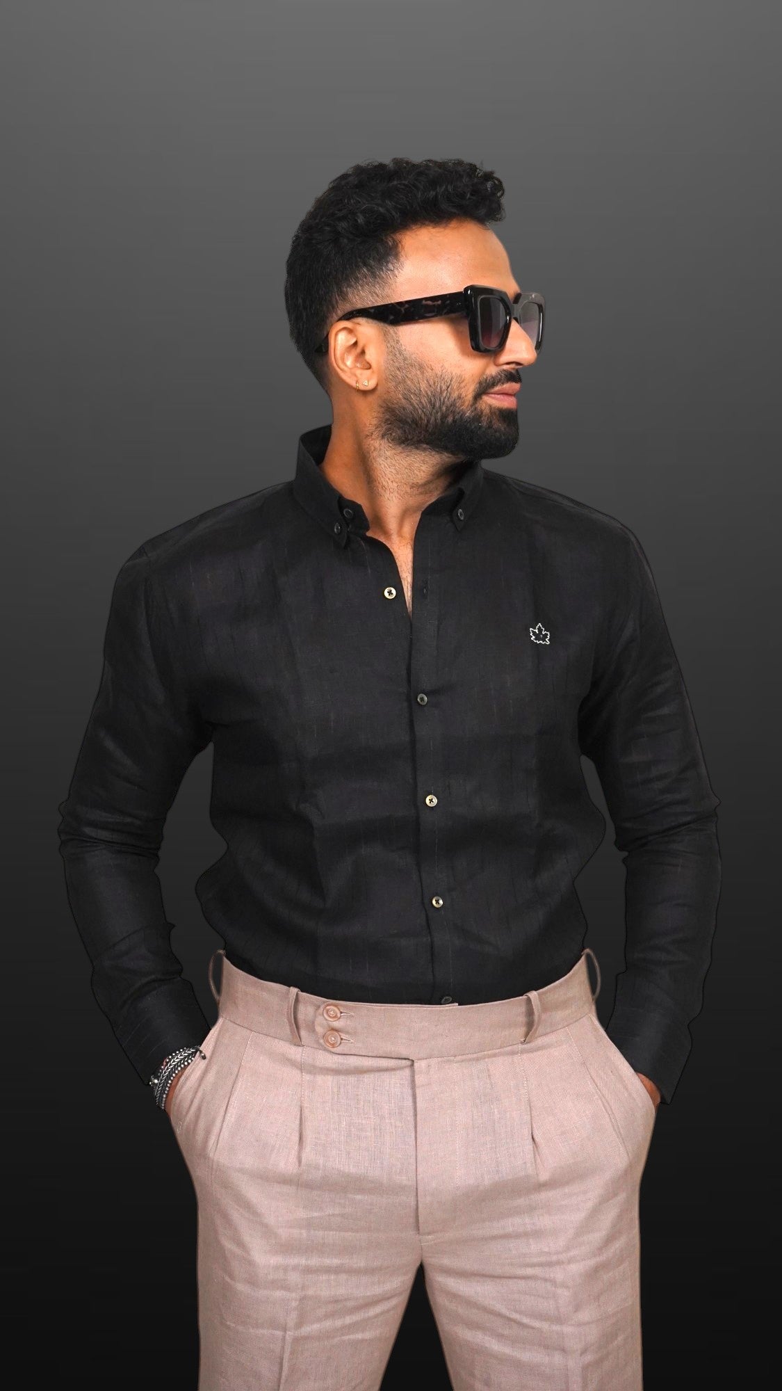 Cut from rich black linen with a subtle sheen, this shirt features understated vertical pinstripes that catch the light just right. Designed with a sharp Mandarin collar and finished with a discreet embroidered emblem on the chest, it strikes the perfect balance between refined and effortless. Whether paired with tailored trousers or styled down, this is your go-to for elevated minimalism.